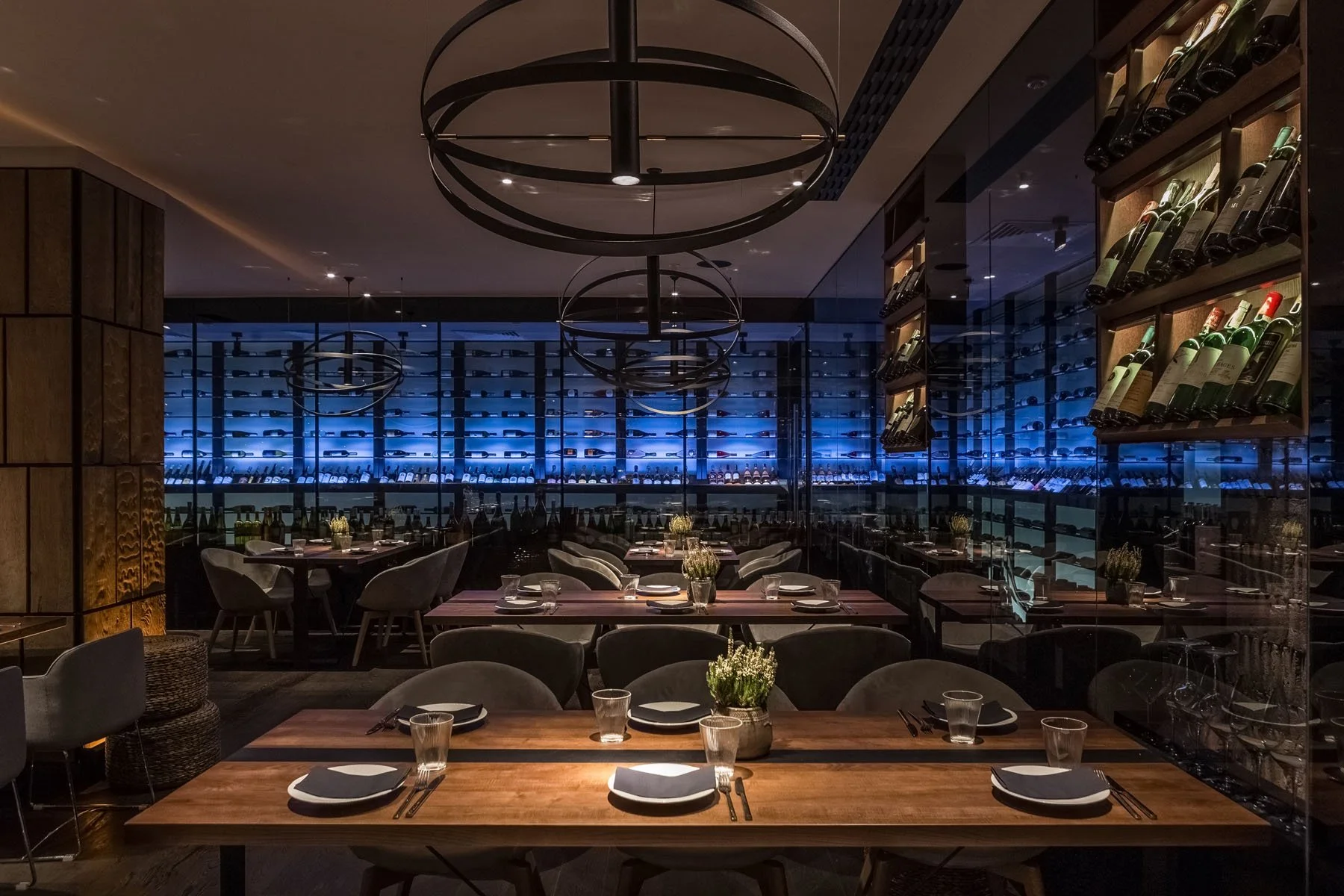 On the ground floor of the restaurant the visitors "greets" the bar, lined with painted in different shades copper panels. At the end of the hall behind the glass there are wine racks with multi-temperature storage modes. Depending on the time of day here are changing the temperature and light schedules. The first and second floors are connected by a stairway, which is permeated with a large metal installation with a dynamic type of lighting. The programmed sequential dimming of the light sources provides a smooth shift of lighting, thereby creating additional dynamics.
