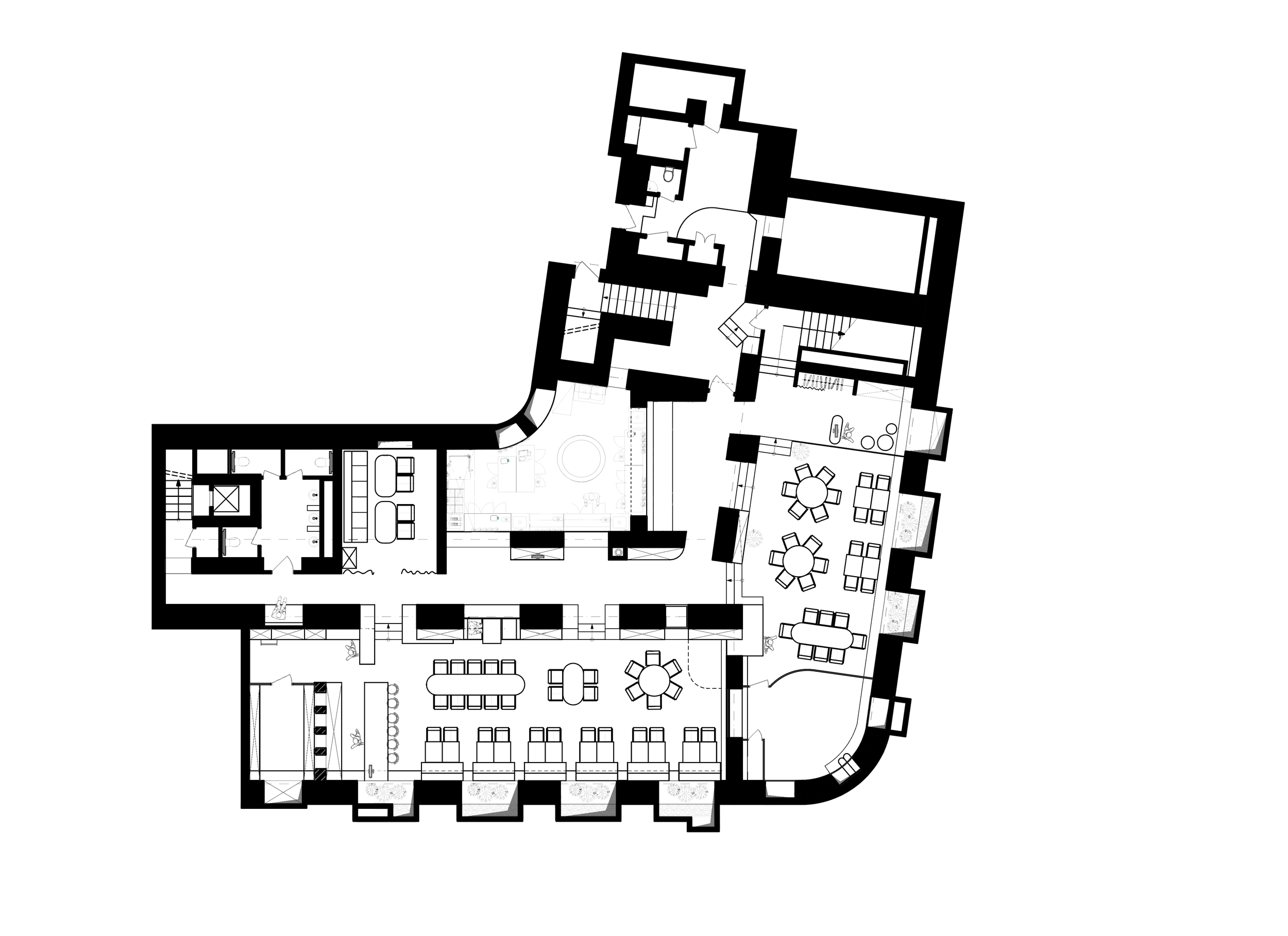 The structural elements of the building's foundation are integrated into the interior. Together with live plants and dramatic lighting effects, they shape a space that embodies local identity and heritage.