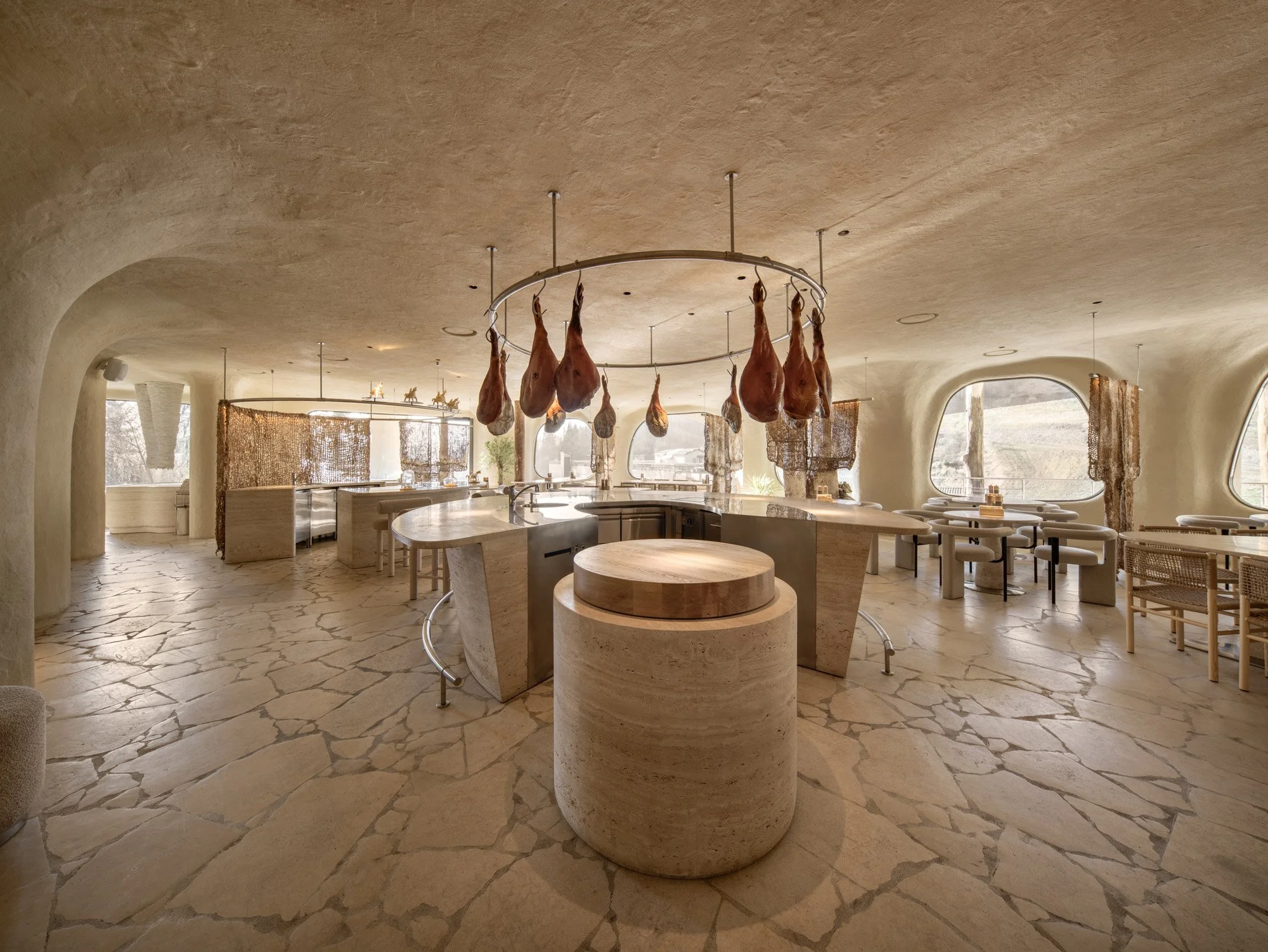 The dining area is organized around three “islands,” each highlighting a local culinary tradition: cheese – featuring the iconic cheese horses; meat – centered on shovdary, traditional smoked pork legs; and spirits – showcasing distillates made from regional herbs and botanicals.