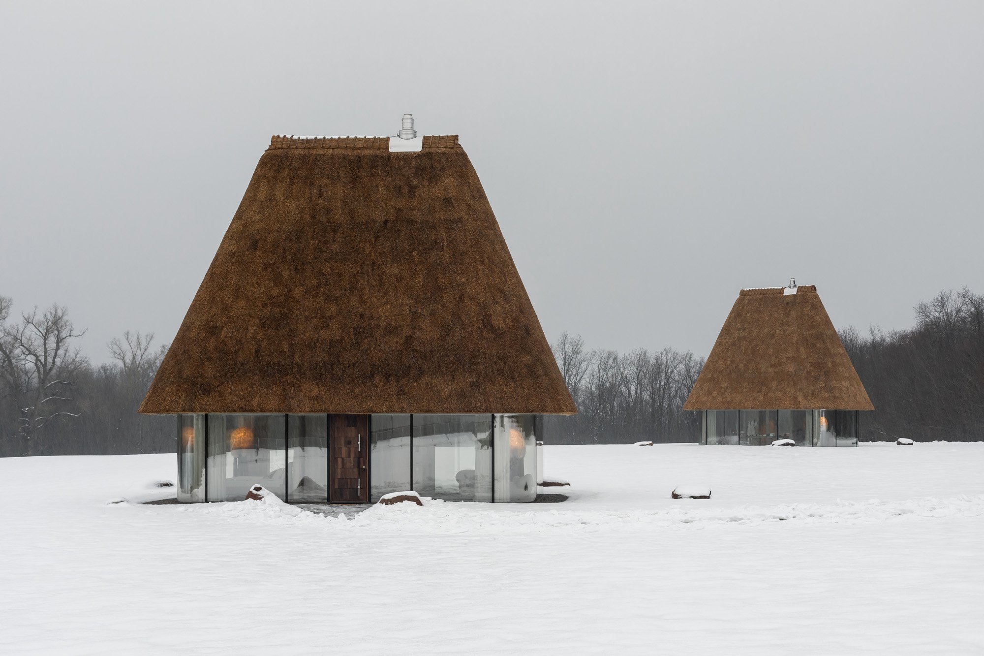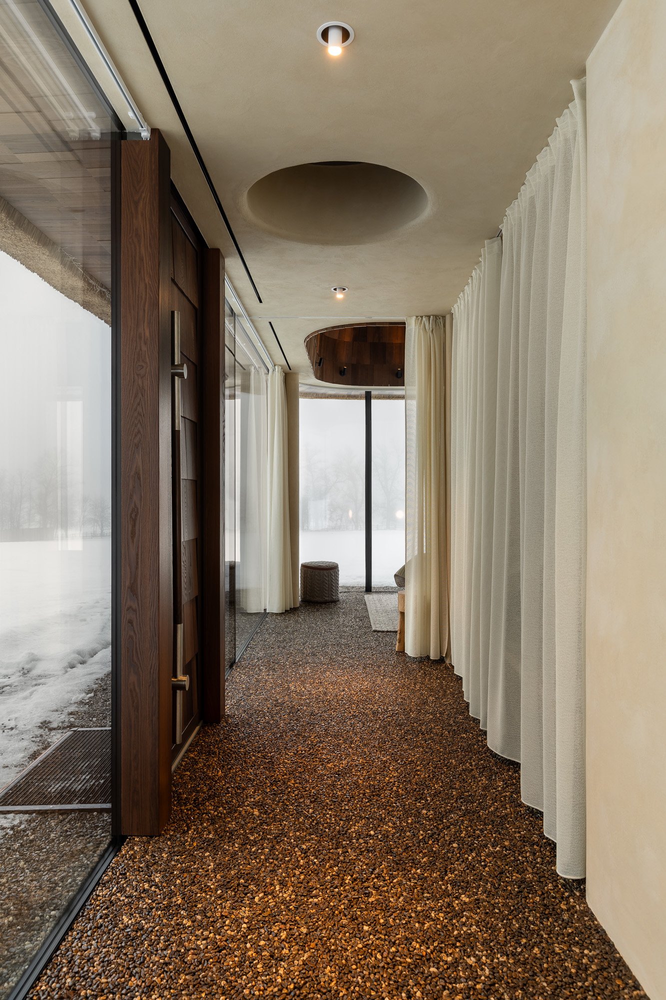 During the day, the fully glazed façades visually dissolve, creating the impression that the massive thatched roof is floating above the landscape. Inside and outside, the floor is finished with a continuous stone-carpet surface, pleasant to the touch and offering a subtle massage-like sensation when walking barefoot.