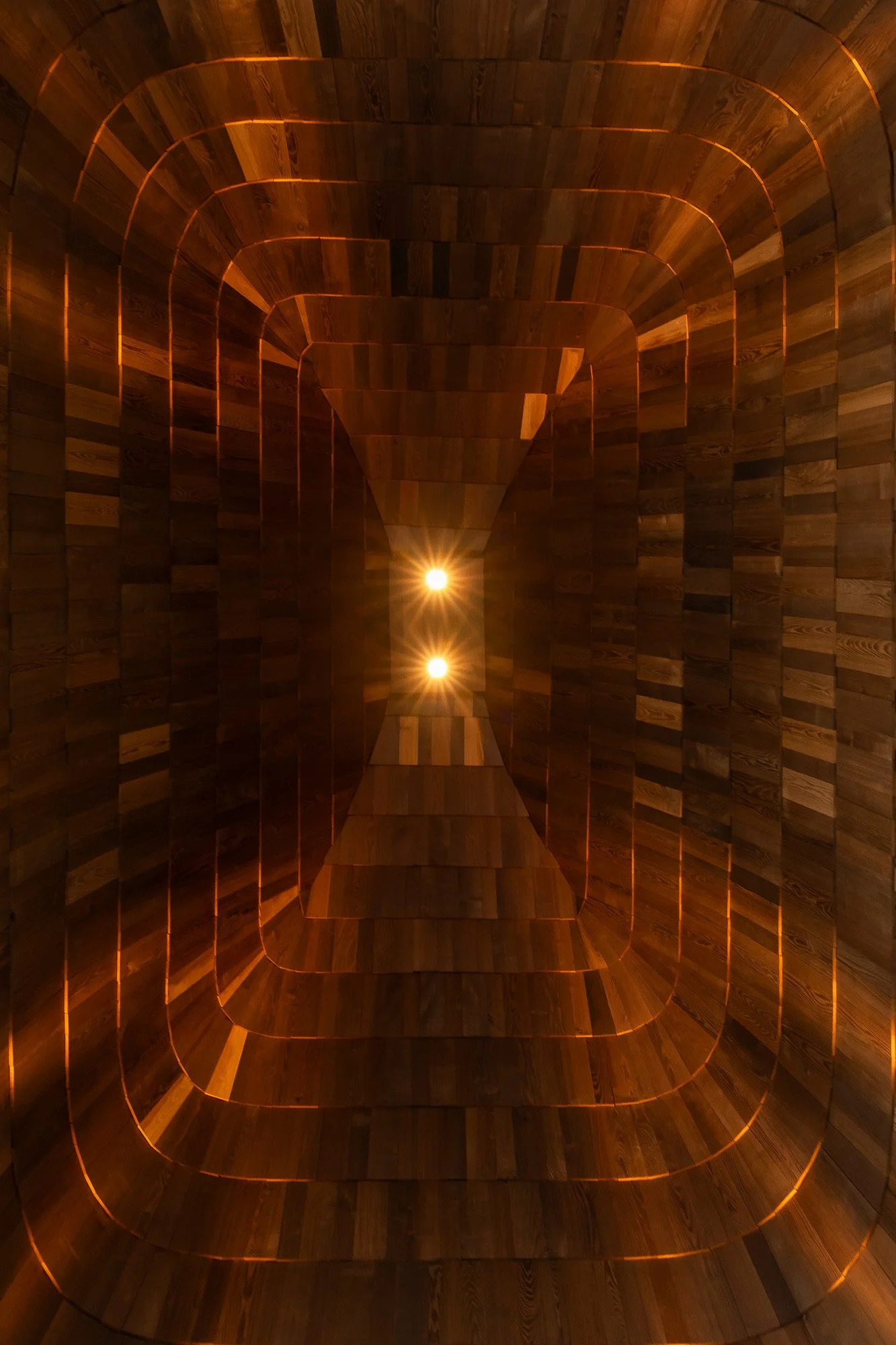 The inner surface of the roof dome is clad in wooden tiles that reference traditional wooden shingles historically used on Ukrainian rooftops. Rising to a height of 10 metres at its apex, the dome enhances the sense of openness and verticality while allowing all engineering systems to remain fully concealed, leaving the walls visually clean and uninterrupted.