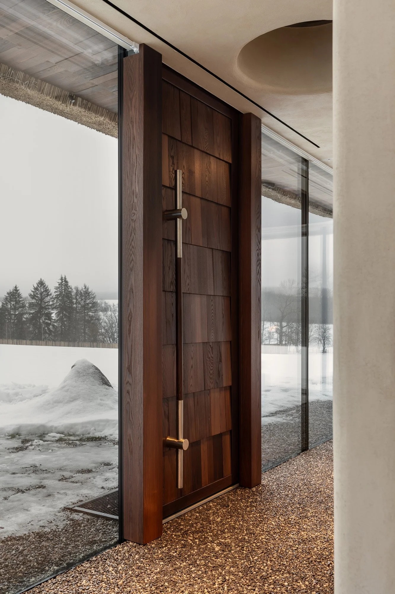 The uninterrupted glazing enhances the sense of immersion in nature, allowing the landscape to become an integral part of the emotional experience. When privacy is needed, guests can close dense yet visually light curtains, operated automatically via a control panel located by the bed.