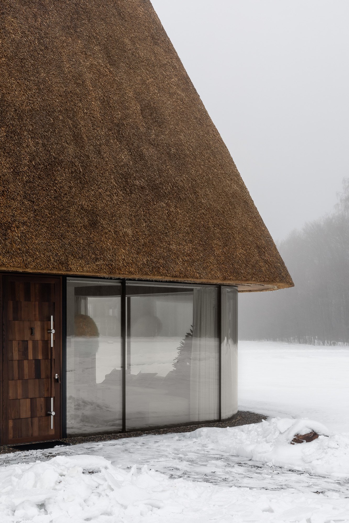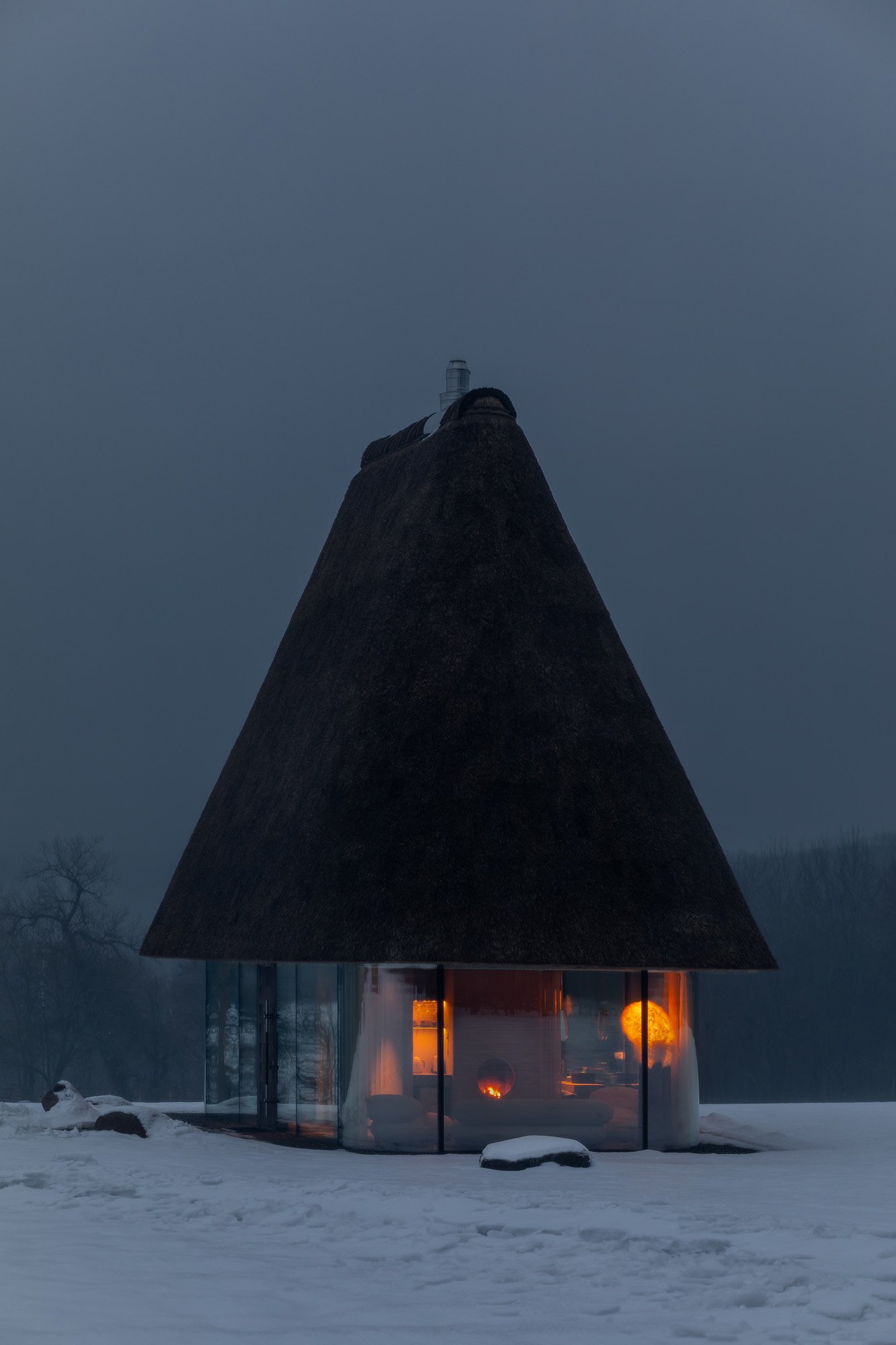 Traditional Ukrainian vernacular architecture evolved through simple yet expressive solutions: thick whitewashed walls, thatched roofs, and regular plastering as an act of care and an aspiration toward order and beauty. In YOD Group’s contemporary interpretation, this pursuit of light and cleanliness is translated into fully transparent glass façades, while the roof – deliberately oversized – becomes the project’s primary architectural gesture.