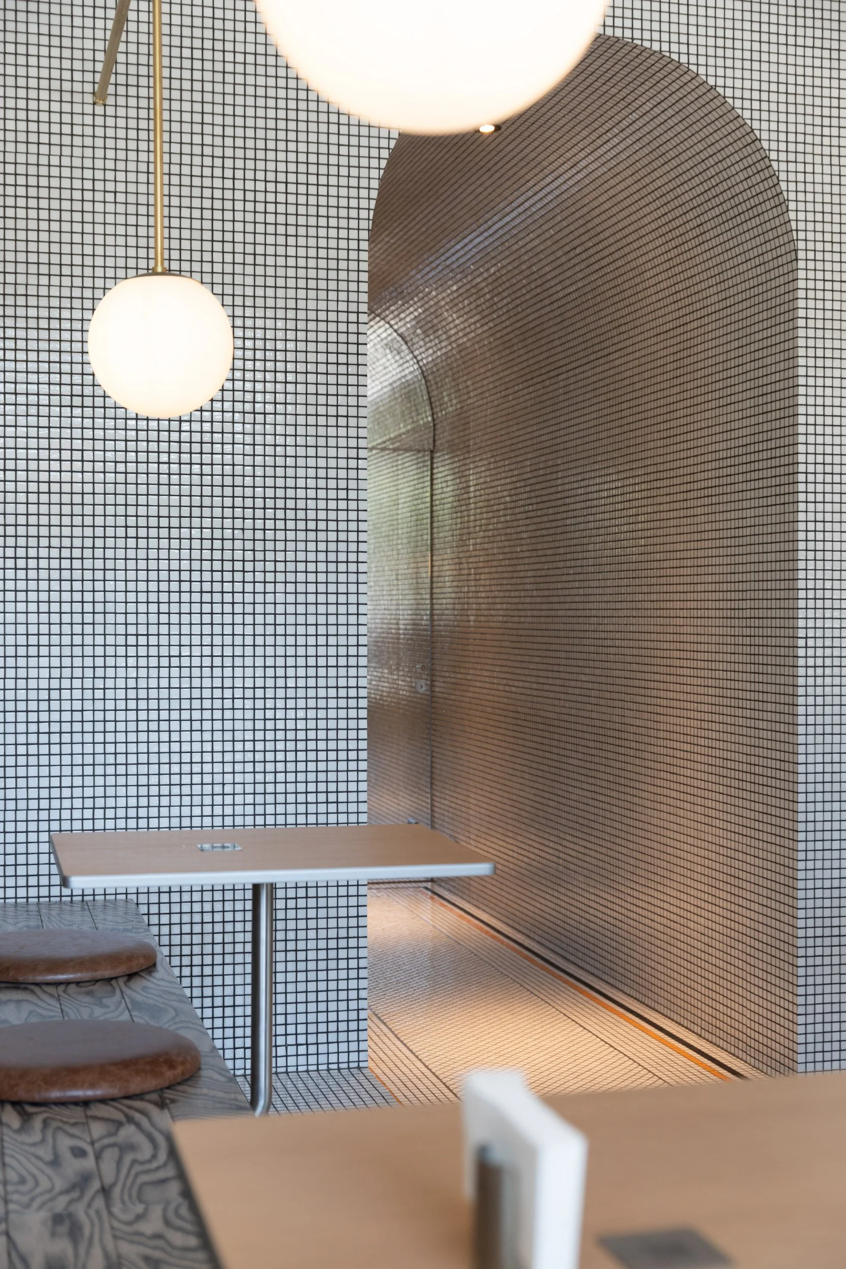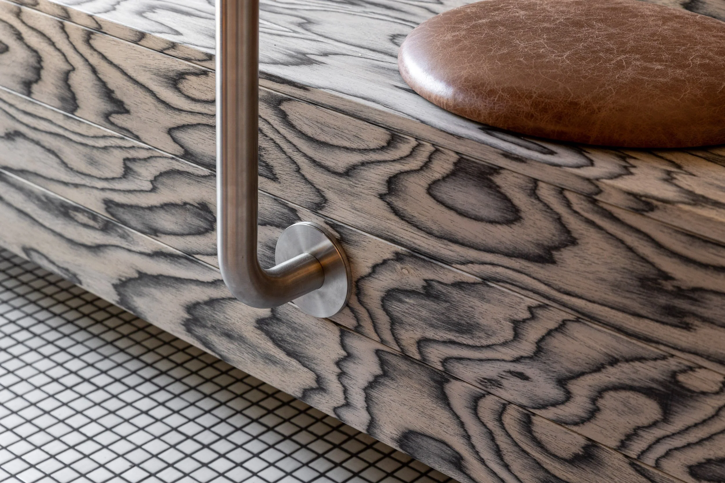 The materials palette of Lumo includes mosaic tiles, metal, wood, and leather. The achromatic palette of the interior is broken by shades of wood, an orange strip on the floor that zones the space, and a bright red sink in the bathroom. Rounded shapes emphasize the hospitable mood of the place. Such as the shades of pendant lamps, the line of the bar counter, and a massive arch portal separating the main hall from the wardrobe and bathrooms.