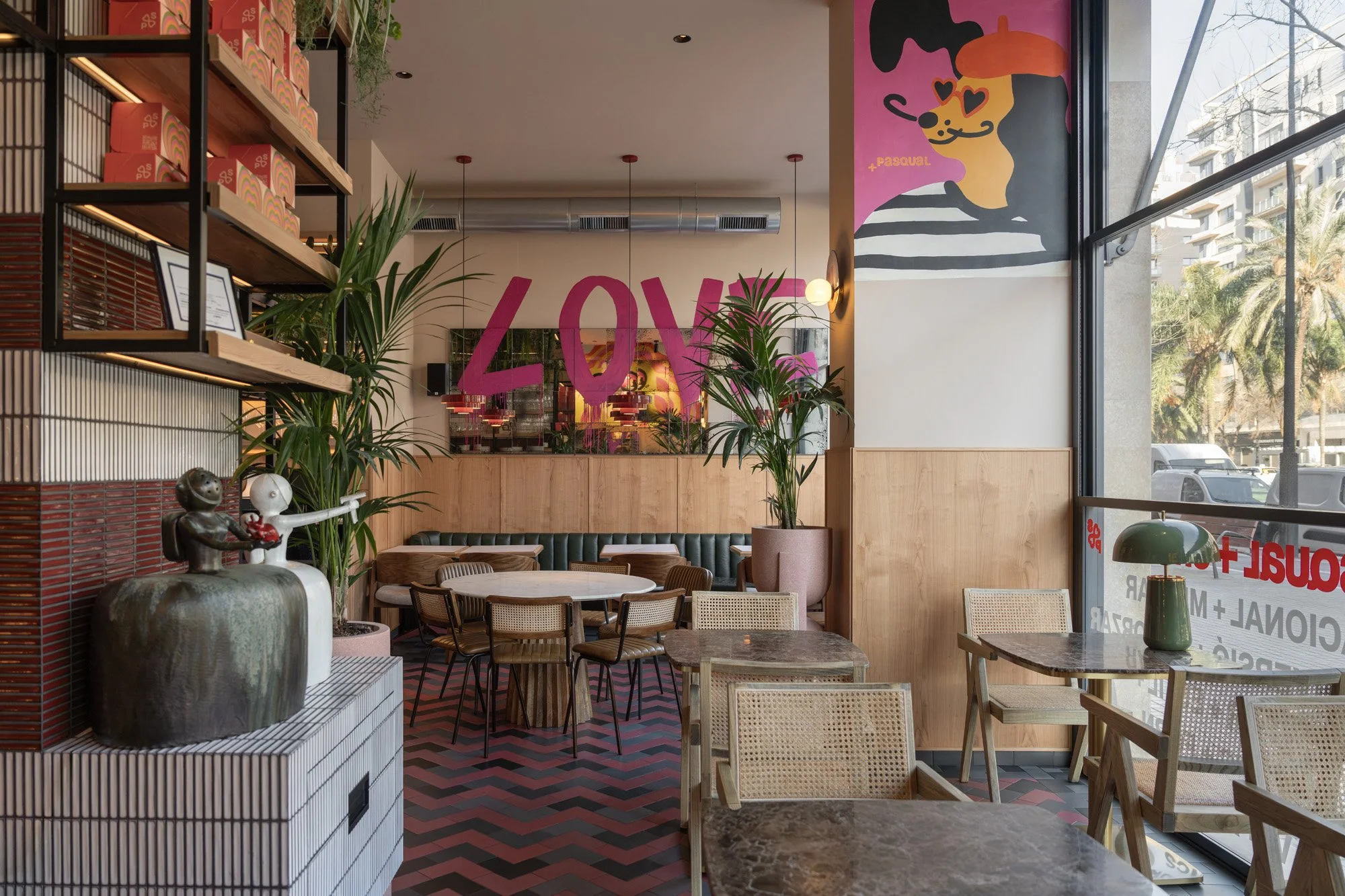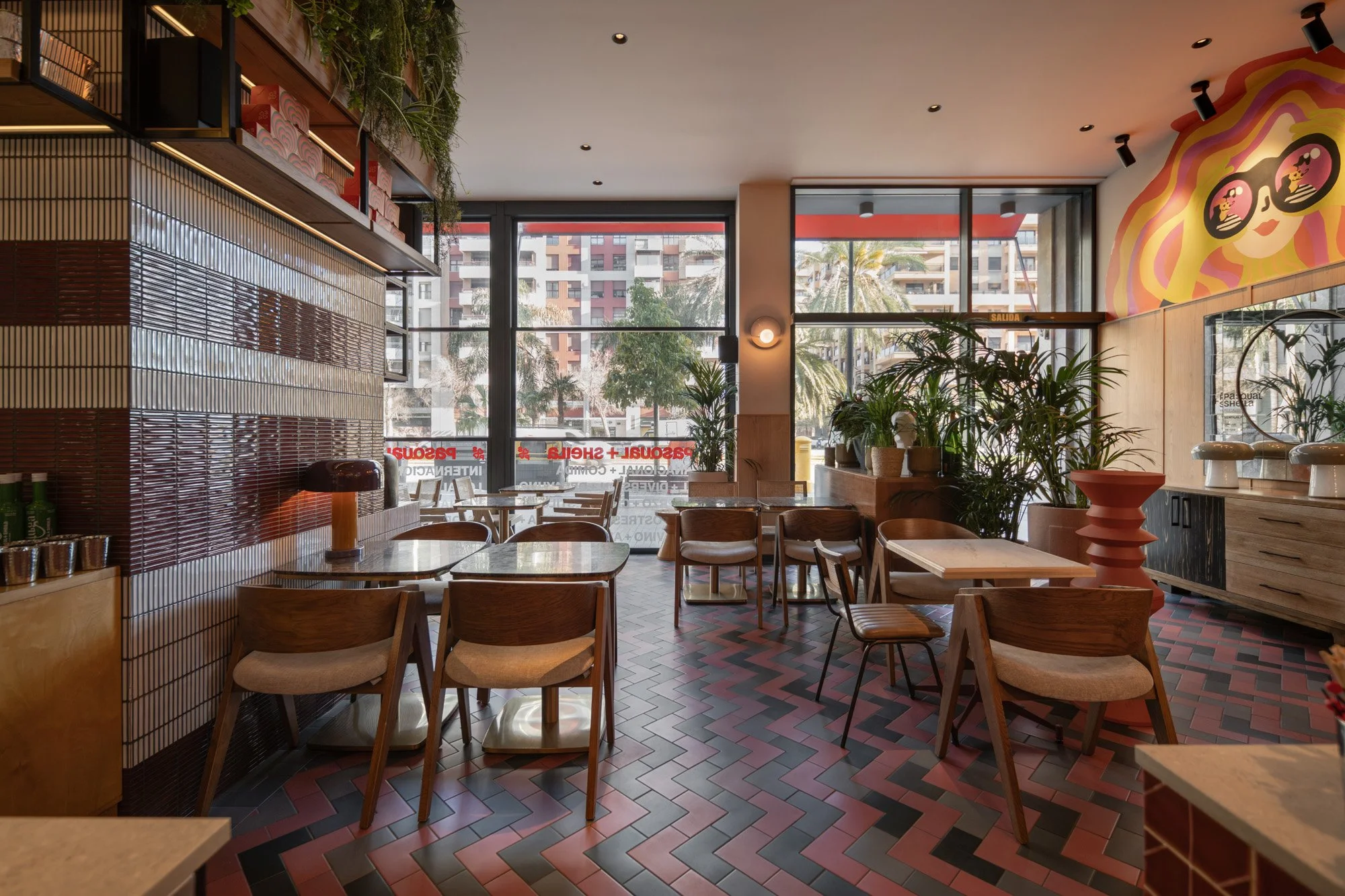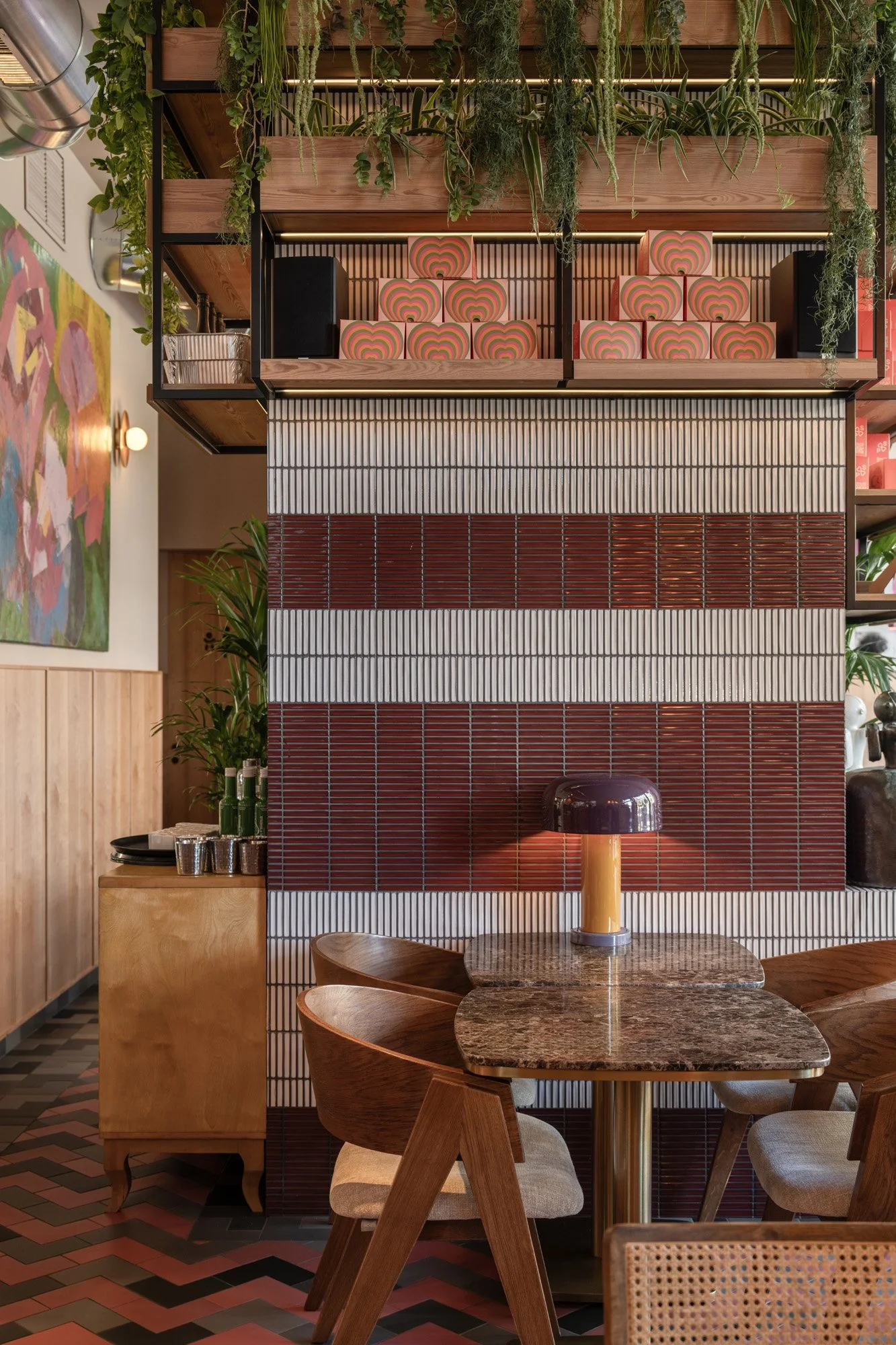 Bold, contrasting graphics introduce an additional visual layer, adding a playful accent and reinforcing the restaurant’s relaxed atmosphere.