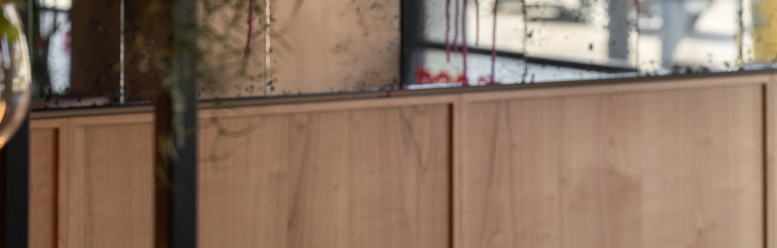 A central column – an unavoidable structural element – was clad in rectangular ceramic tiles, with a storage unit integrated at its base. In this way, a spatial constraint was transformed into a functional feature, serving as a waitstaff station.