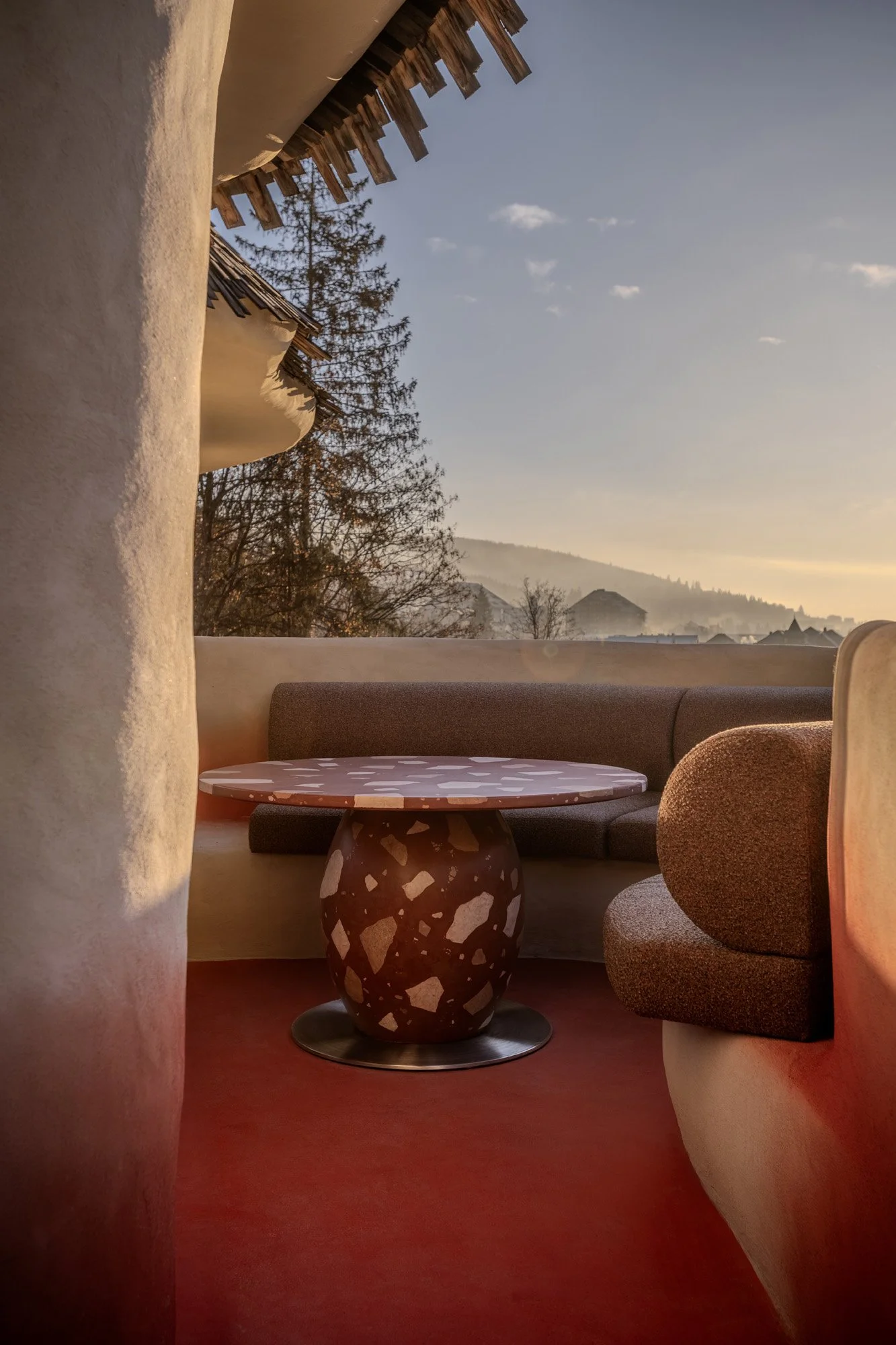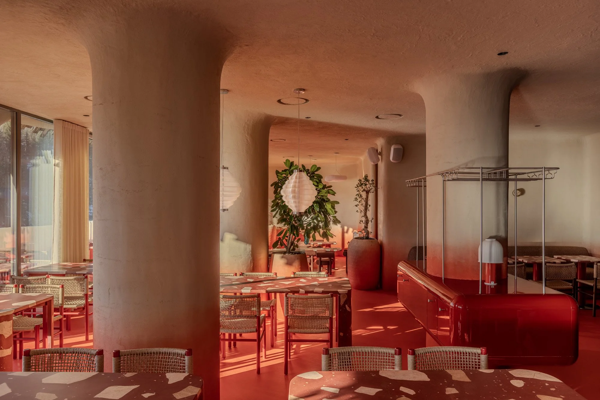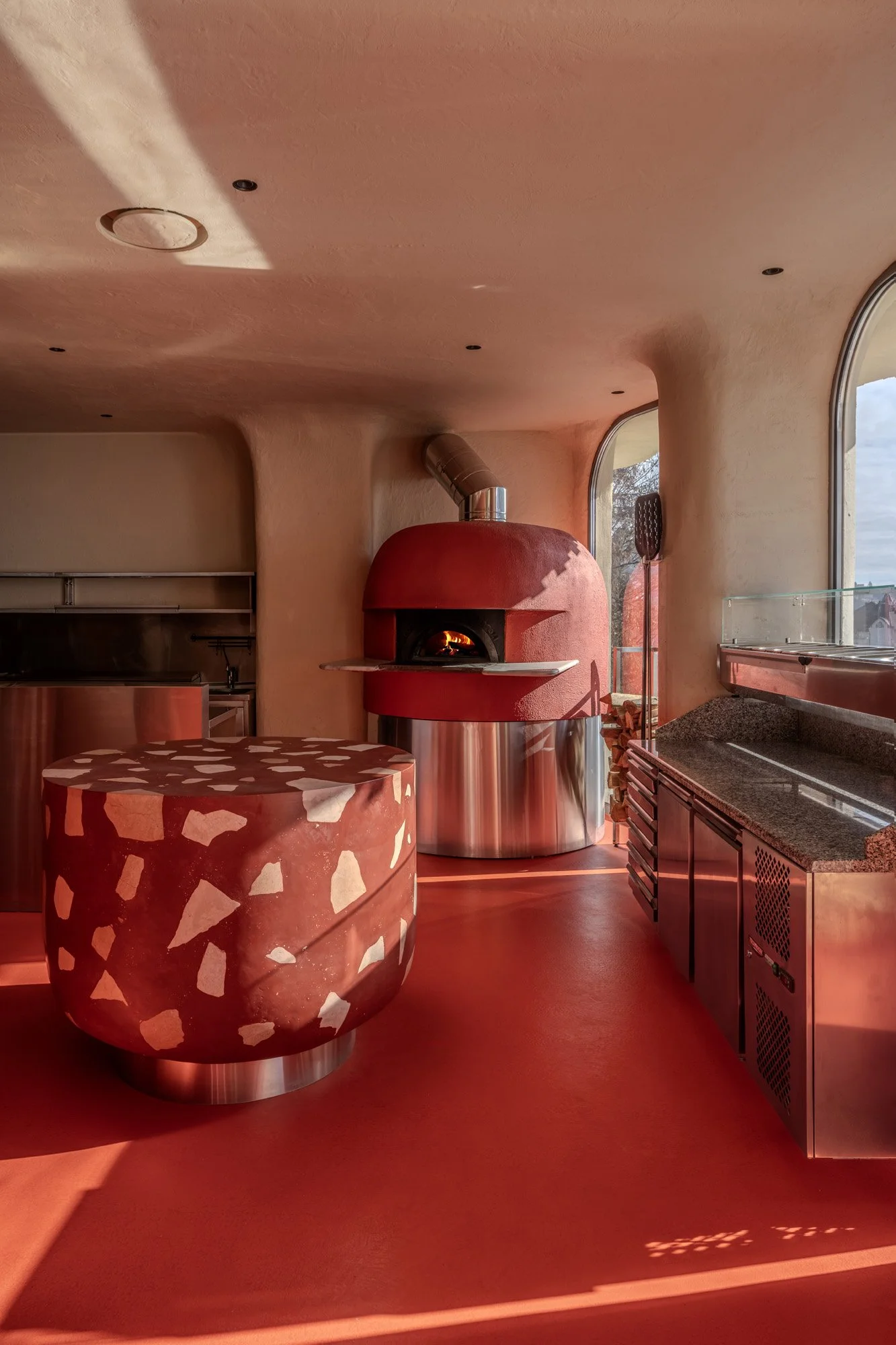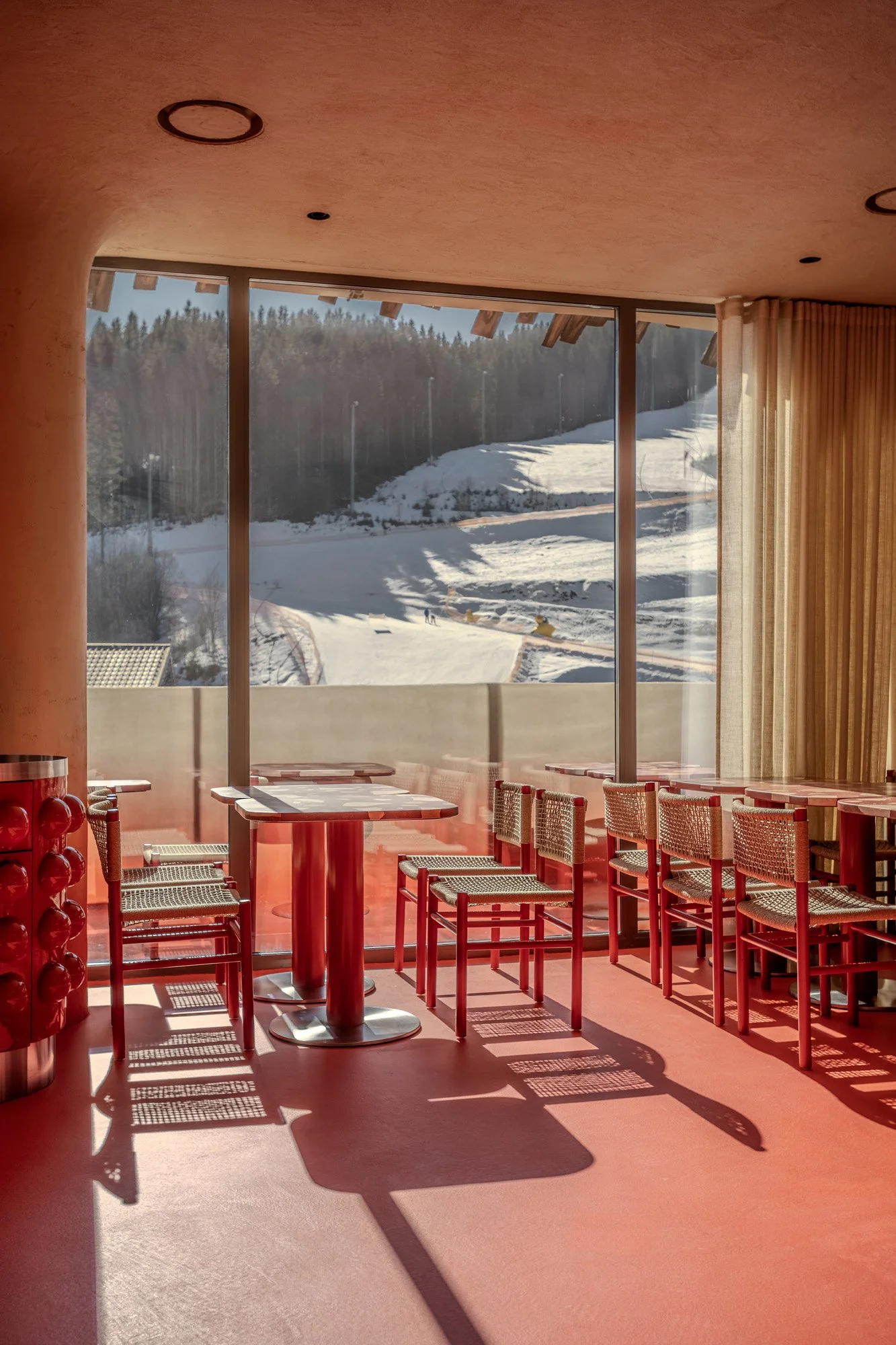 Rosso is a family-friendly Italian restaurant located at the Bukovel ski resort – part of the Hrybova Khata hospitality complex. The bright, welcoming interior is defined by a warm, sandy-red palette, creating the feeling of a relaxed family getaway in the mountains.