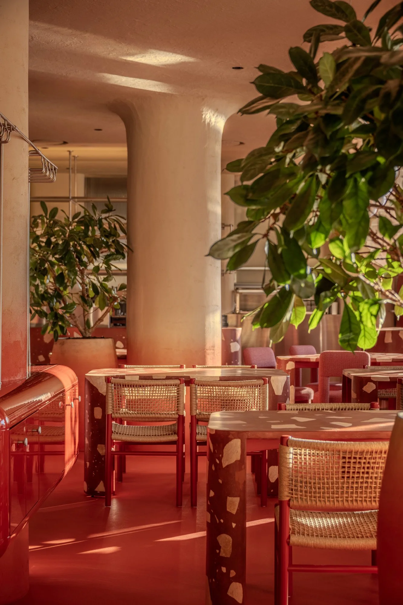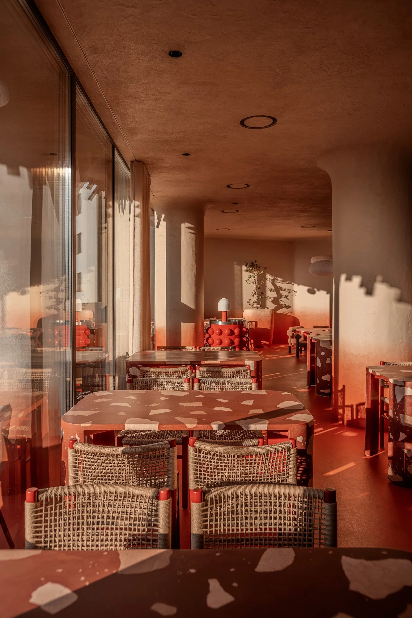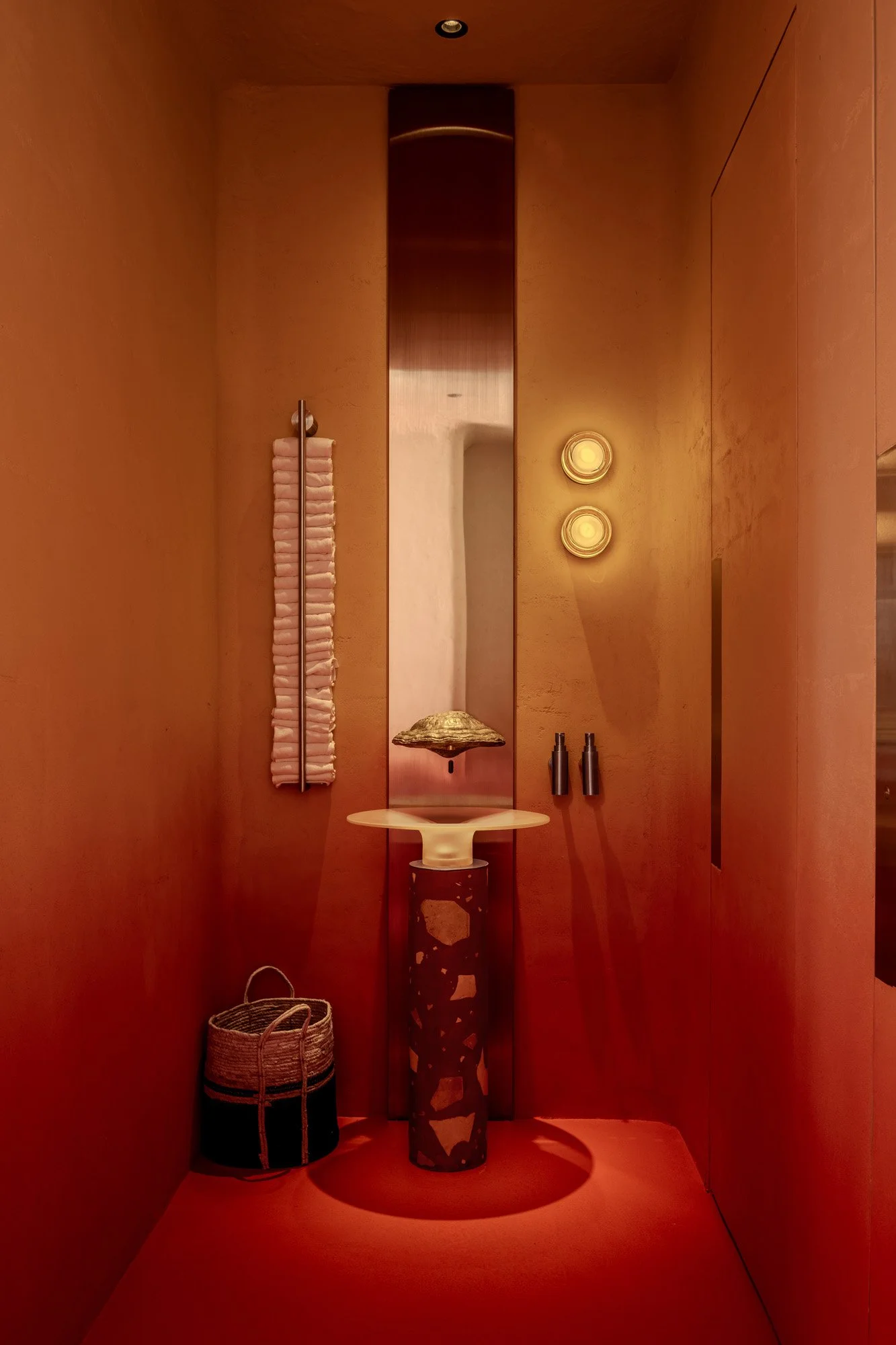 The color palette draws inspiration from the fly agaric – one of the most vibrant and recognizable mushrooms. A gradient across the walls transitions from deep red at the base to soft pinks and warm sandy tones above, shaping the overall energy of the space.