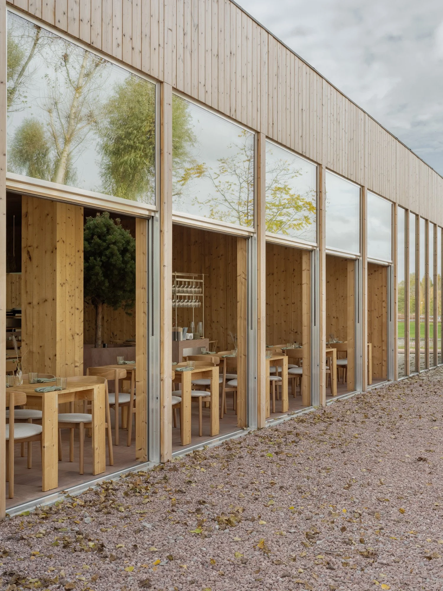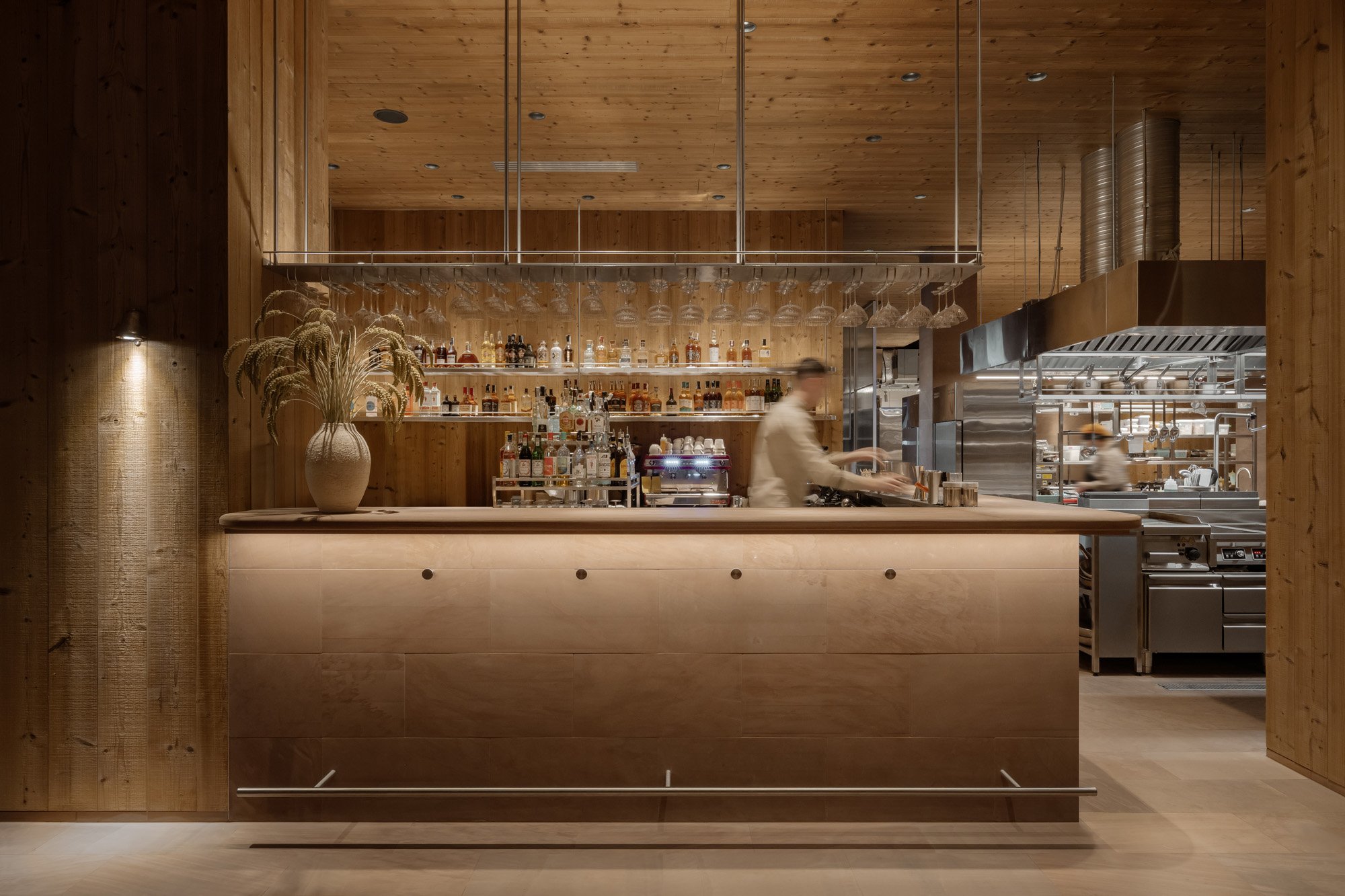 Large floor-to-ceiling windows with a guillotine opening system rise vertically in warm weather, erasing the boundary between the restaurant and the surrounding garden and merging them into one seamless environment. The open kitchen further integrates the experience, making the act of cooking part of the guest’s connection to the place
