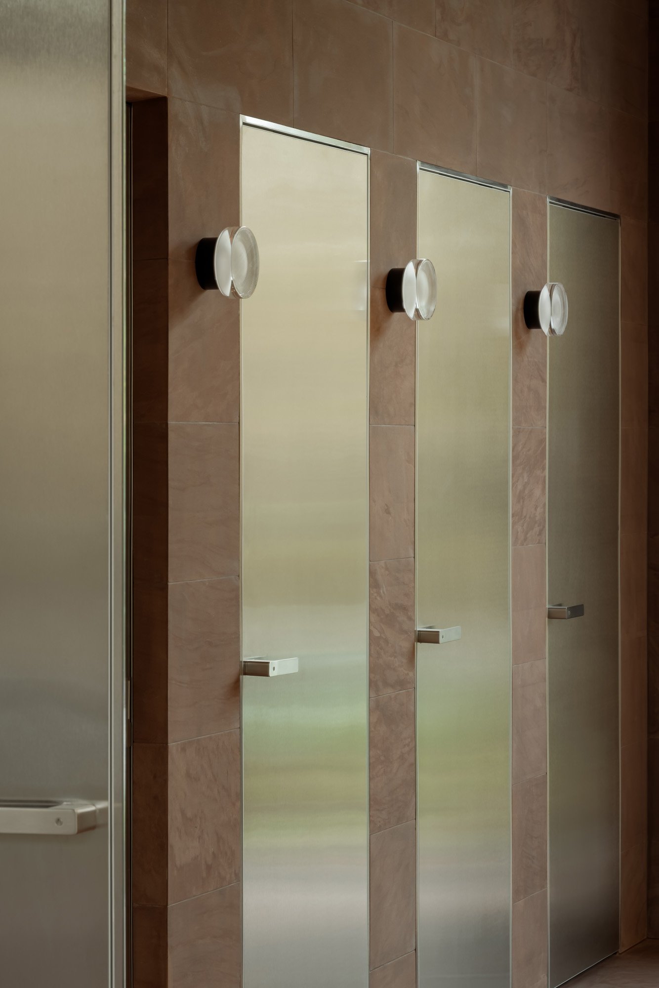 Local pine trees planted in oversized tubs enhance the sense of continuity between inside and out. Circular skylights introduce additional natural light essential for the plants, while also giving the minimalist interior a subtly cosmic feel, softening its straight lines with rounded forms