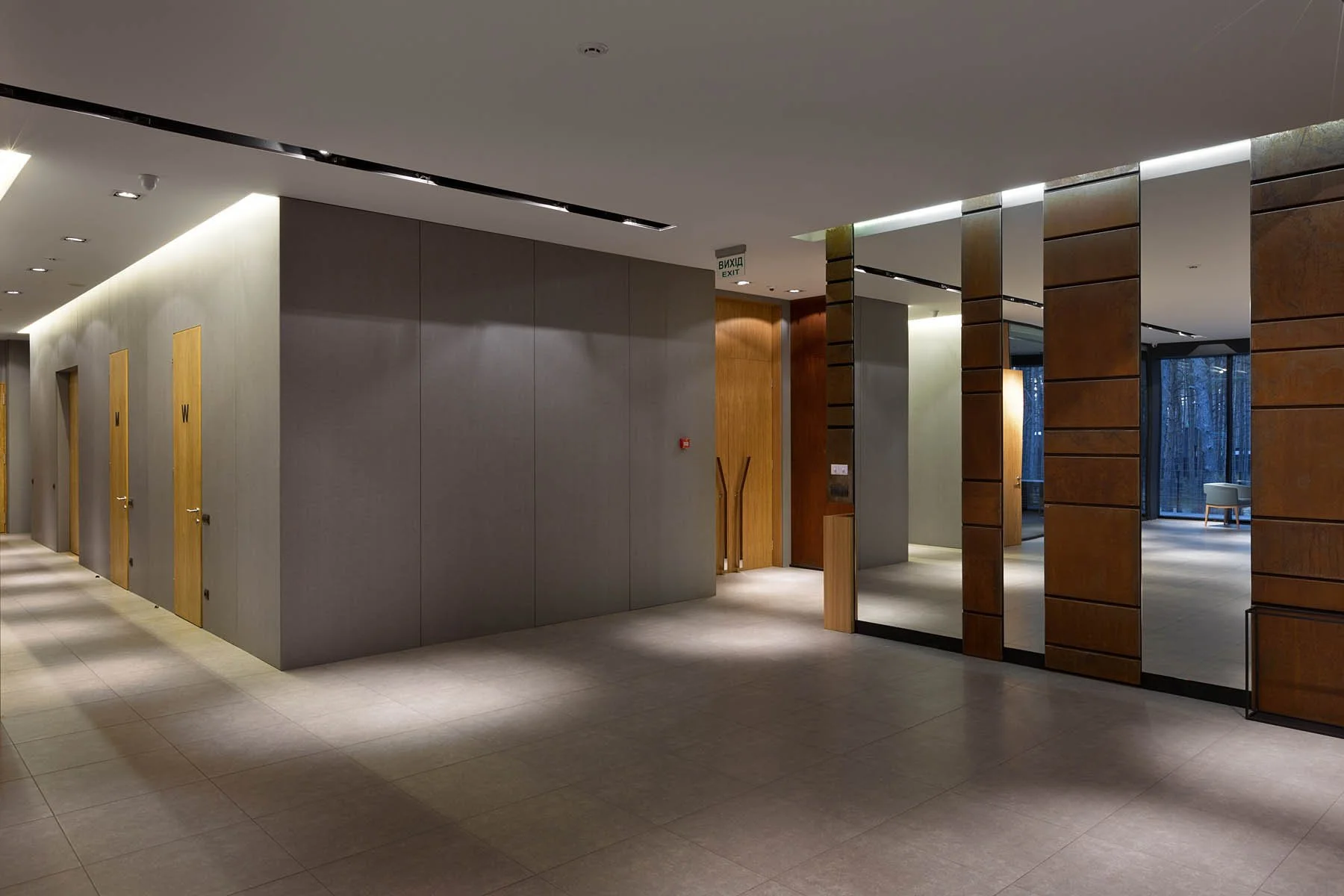 The task was to create a comfortable, friendly space, that would correspond to the general idea of Relax Park Verholy spa-complex. Accessing the building guests must to be tuned to business communication and new information, but at the same time they should feel that they are far from the city. The exterior natural materials – water-resistant plywood and stone panels – are harmonized with the natural colors and textures of the wood. And the façade, made from rusty-red colored corten steel, is a visual accent inviting guests inside.