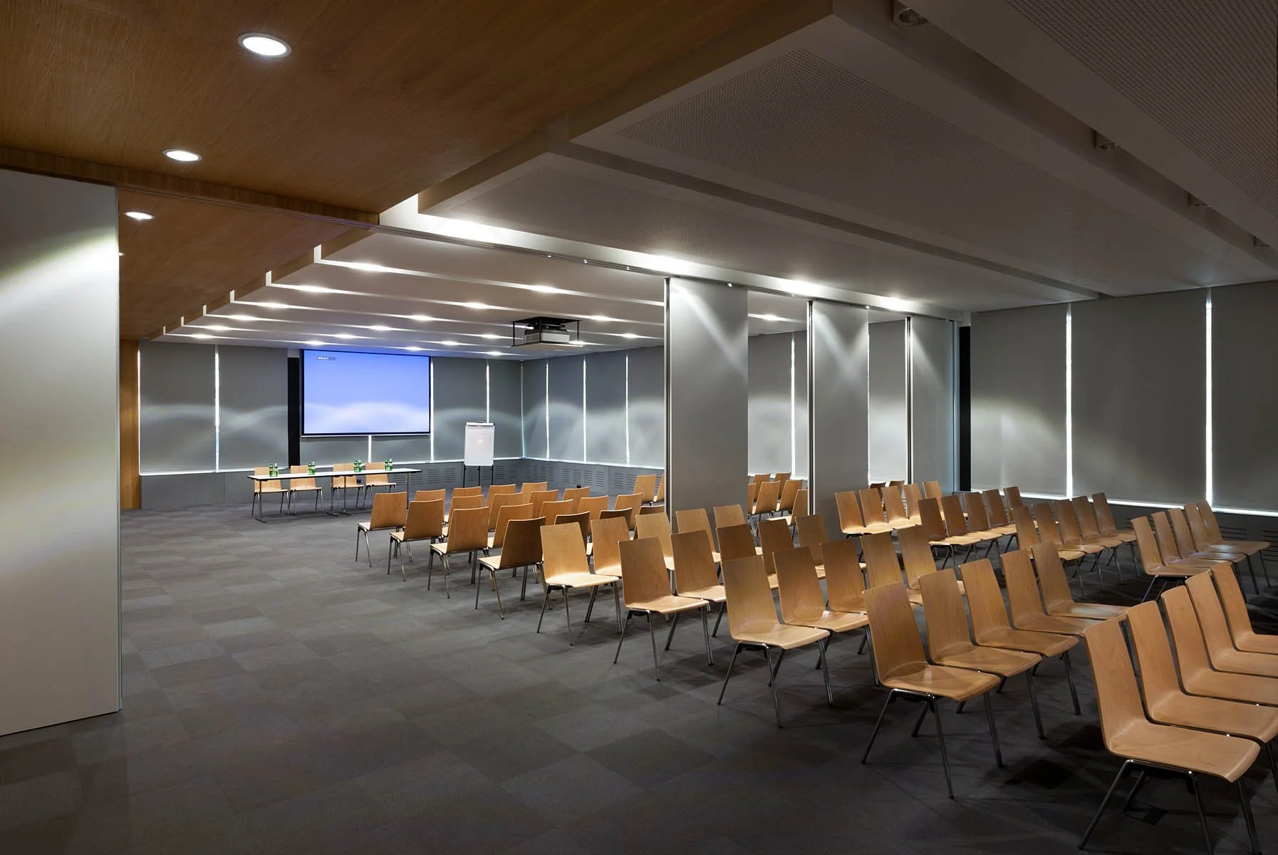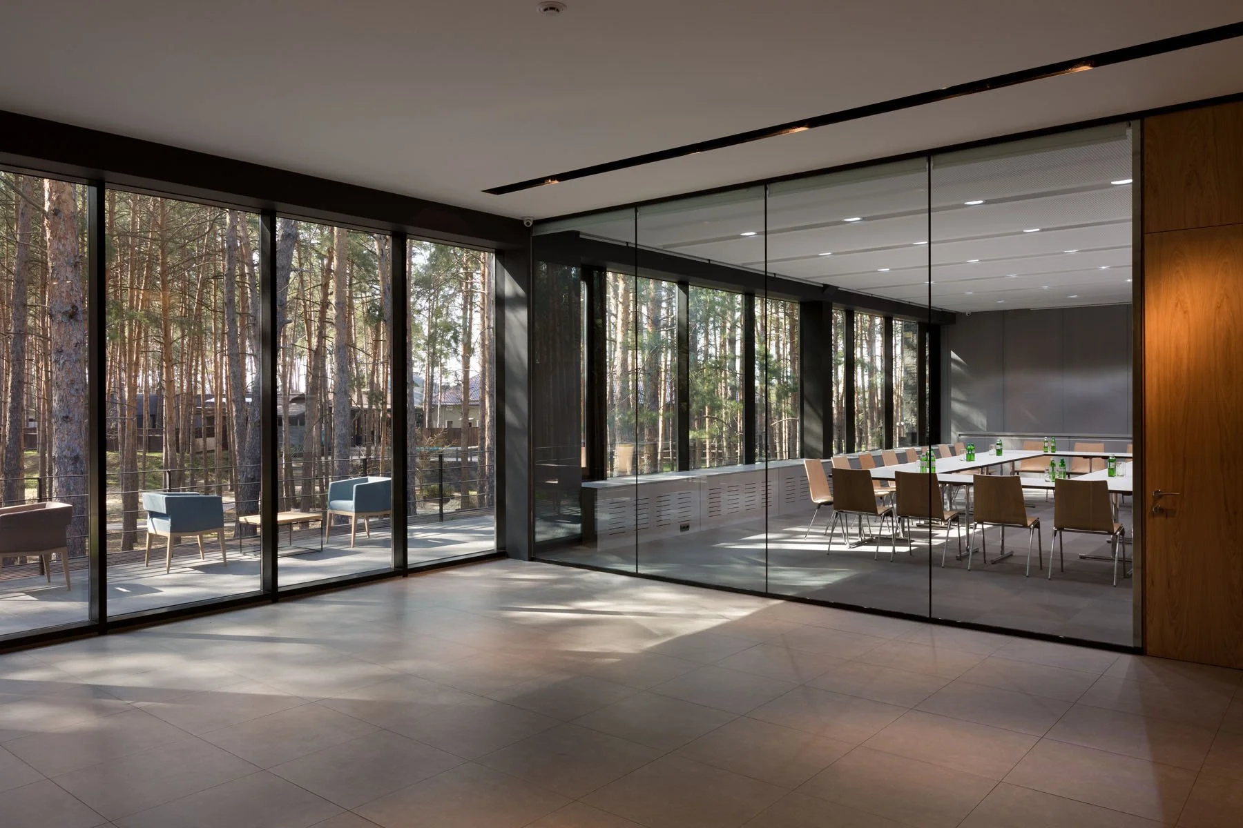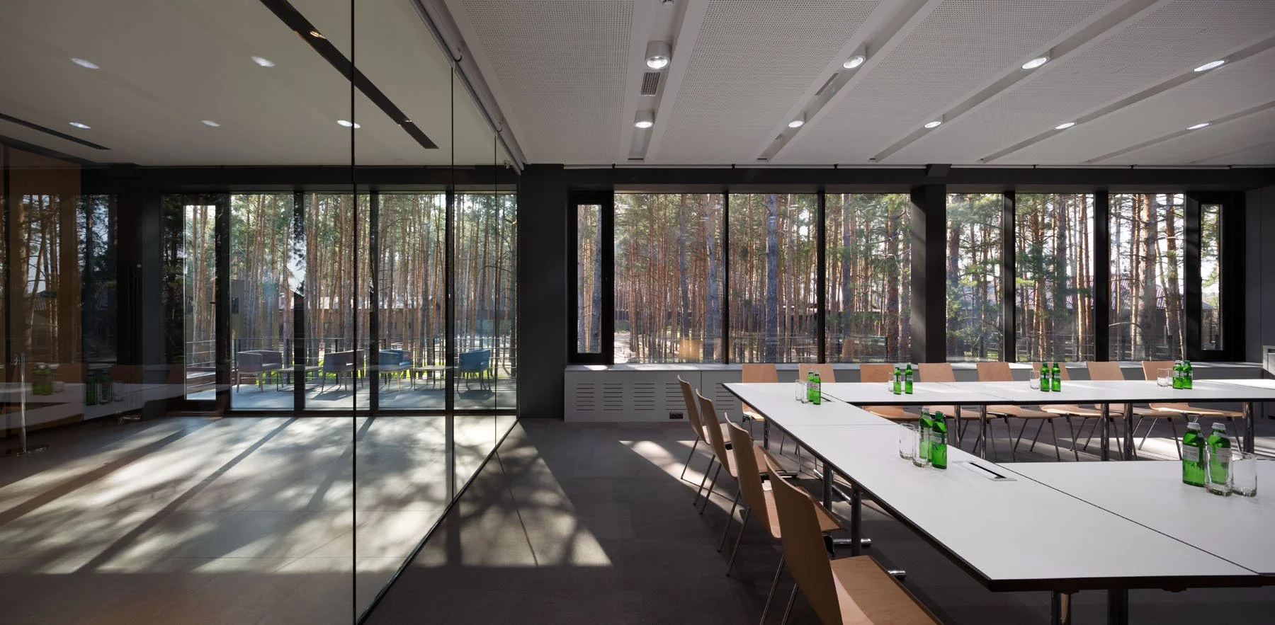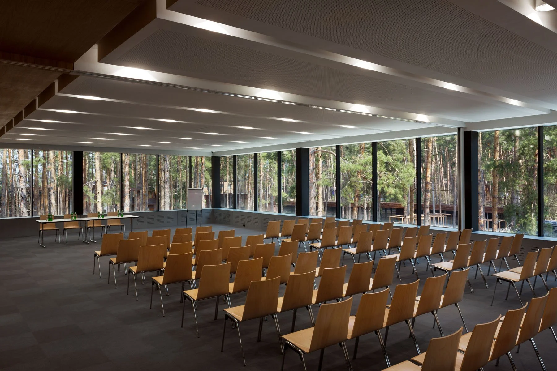 The space of conference hall is functionally zoned. For example, in the main hall the use of mobile acoustic panels lets to split the room into two working areas. During the daytime natural lighting is also used as much as possible thanks to three walls glazed almost from the floor to the ceiling. Wood, metal and linear elements dominate in the interior and they are visually combined with exterior and nature around.