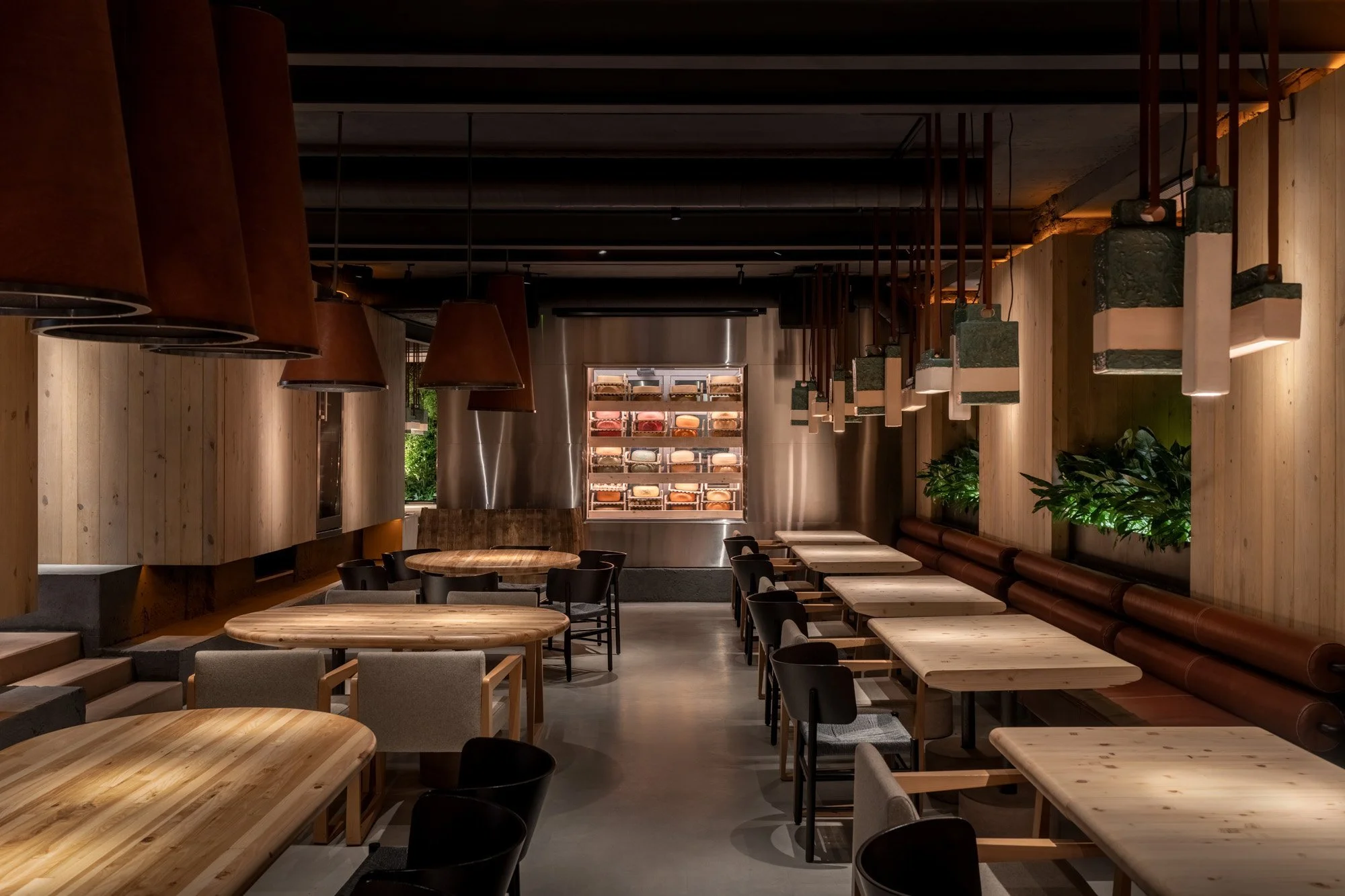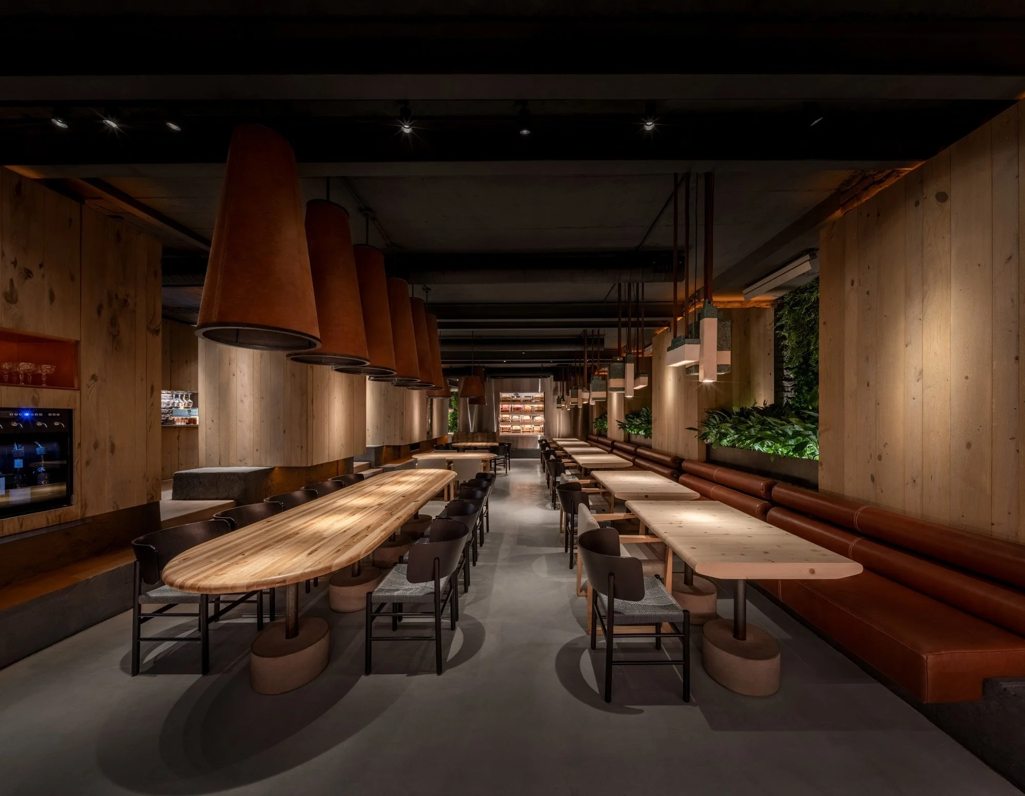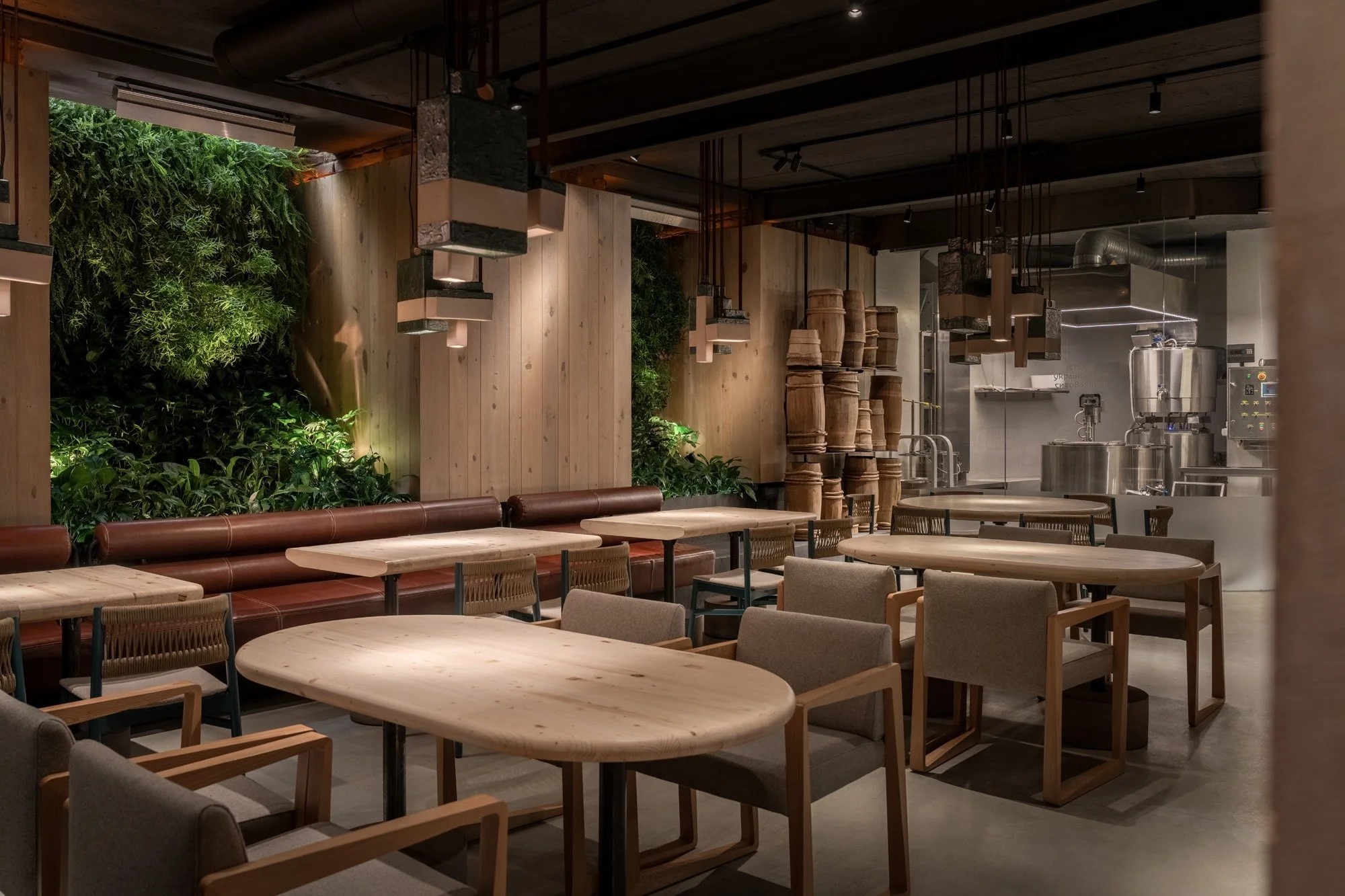 Конструктивні елементи фундаменту будівлі інтегровані у інтер’єр. У поєднанні з автентичними матеріалами, живими рослинами та світловими ефектами, вони формують атмосферу місця, що розкриває суть локальної ідентичності.