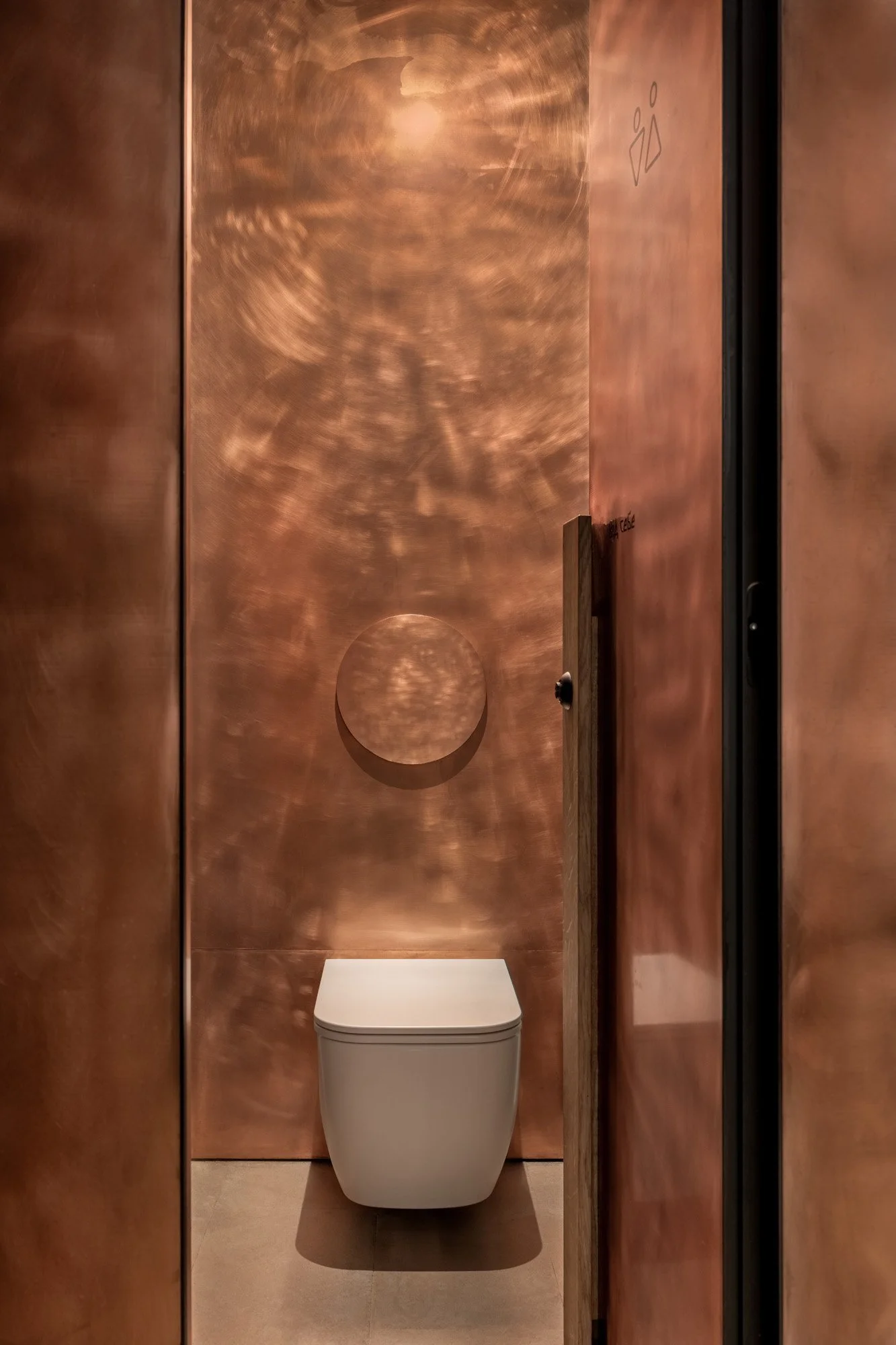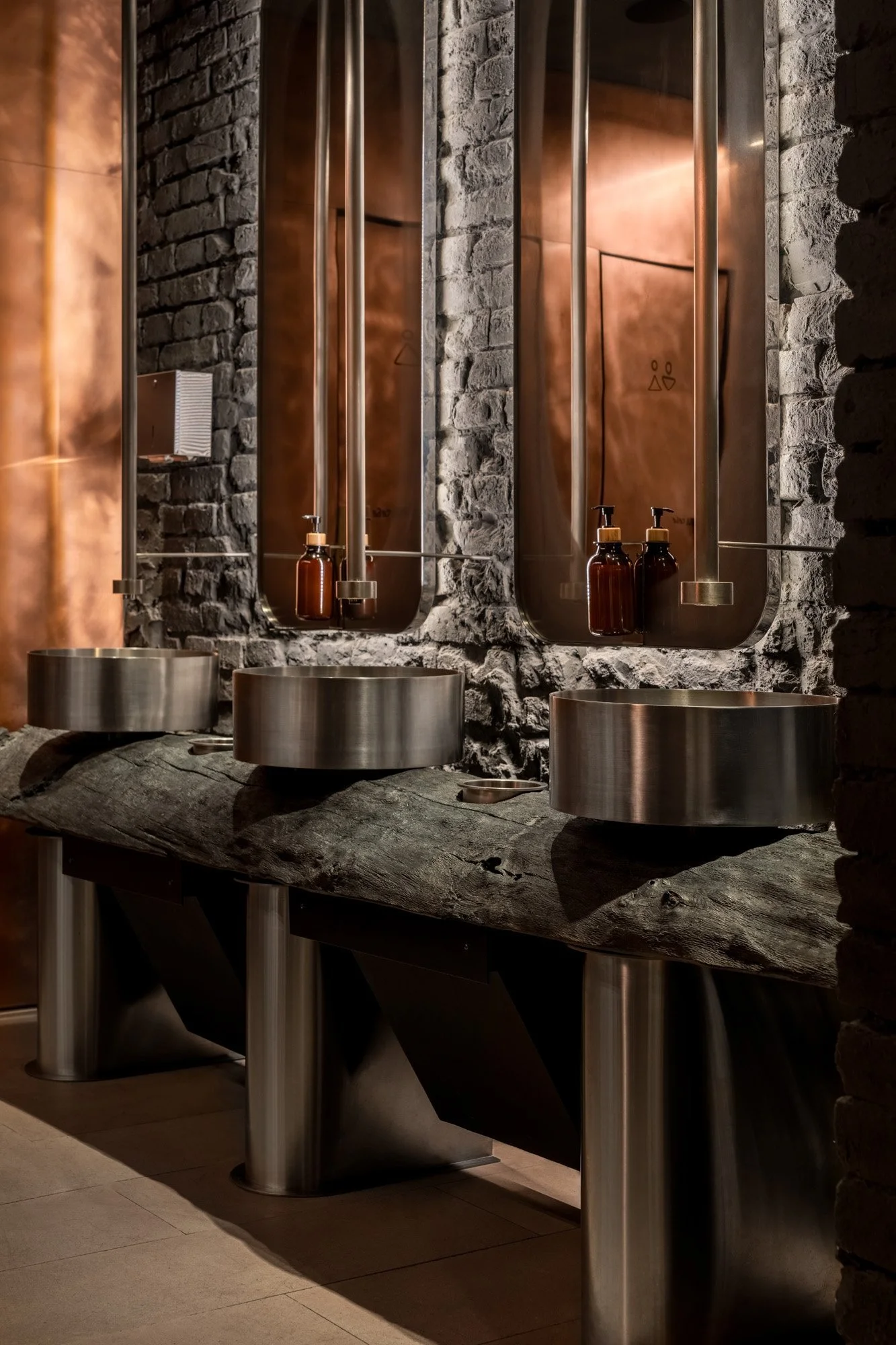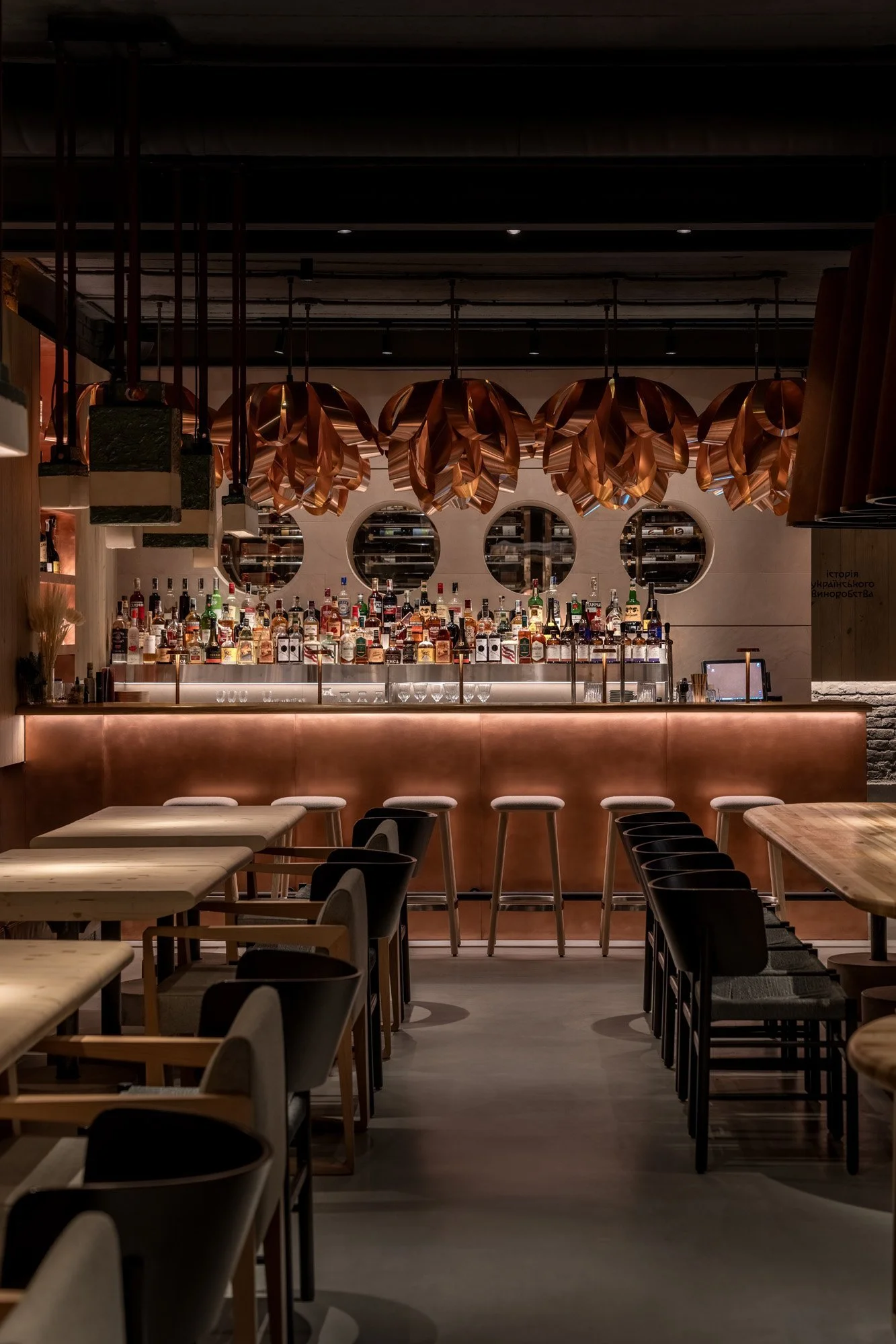 Теребовлянський вапняк з його унікальною фактурою та винним відтінком використано на підлозі, стелі та стінах. Це локальний матеріал, який добувають у кар’єрі в Теребовлі Тернопільської області. Його широко застосовують для парканів та оздоблення фасадів, а от в інтер’єрах цей вапняк майже не зустрінеш. Дизайнери зазвичай надають перевагу італійському або турецькому каменю. Втім, локальний вапняк цілком придатний для оздоблення поверхонь всередині будинків, він має власний цікавий відтінок, що додає простору глибини та тепла. Другим ключовим матеріалом в проекті стала мідь. Нею оздоблена стіна в меншому залі, фасад бару та поверхні в санвузлах.