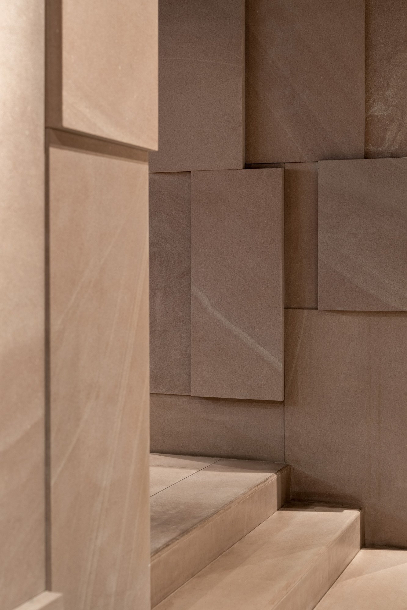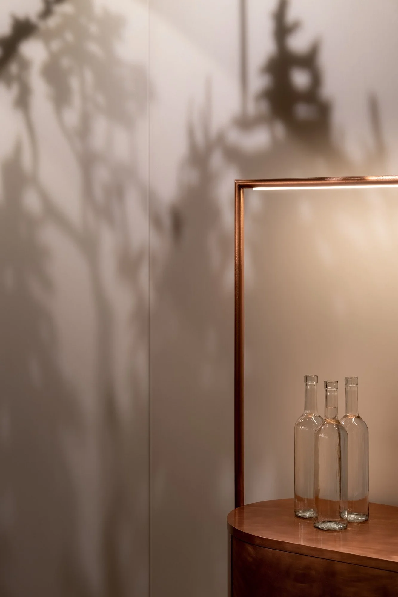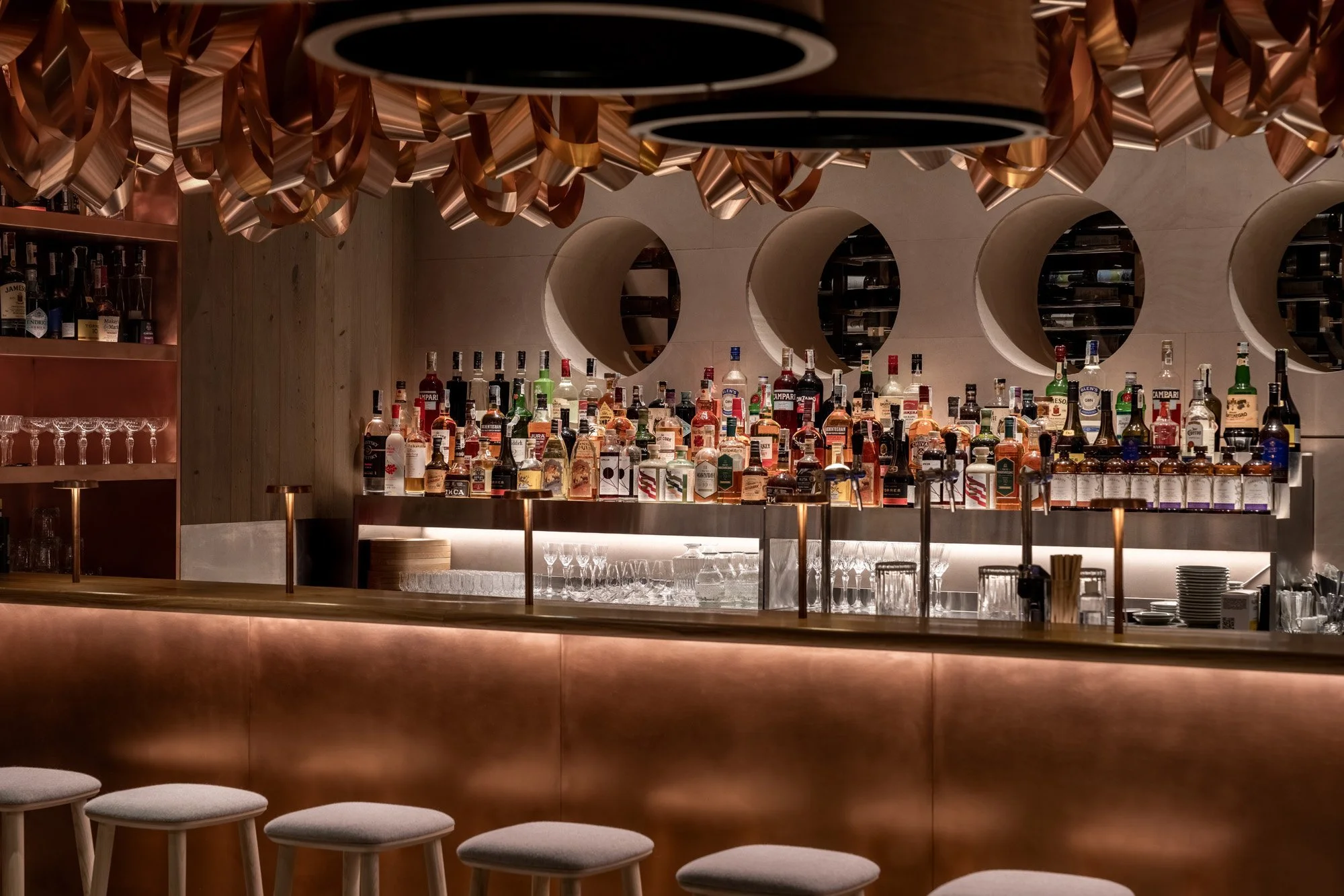 Теребовлянський вапняк з його унікальною фактурою та винним відтінком використано на підлозі, стелі та стінах. Це локальний матеріал, який добувають у кар’єрі в Теребовлі Тернопільської області. Його широко застосовують для парканів та оздоблення фасадів, а от в інтер’єрах цей вапняк майже не зустрінеш. Дизайнери зазвичай надають перевагу італійському або турецькому каменю. Втім, локальний вапняк цілком придатний для оздоблення поверхонь всередині будинків, він має власний цікавий відтінок, що додає простору глибини та тепла. Другим ключовим матеріалом в проекті стала мідь. Нею оздоблена стіна в меншому залі, фасад бару та поверхні в санвузлах.