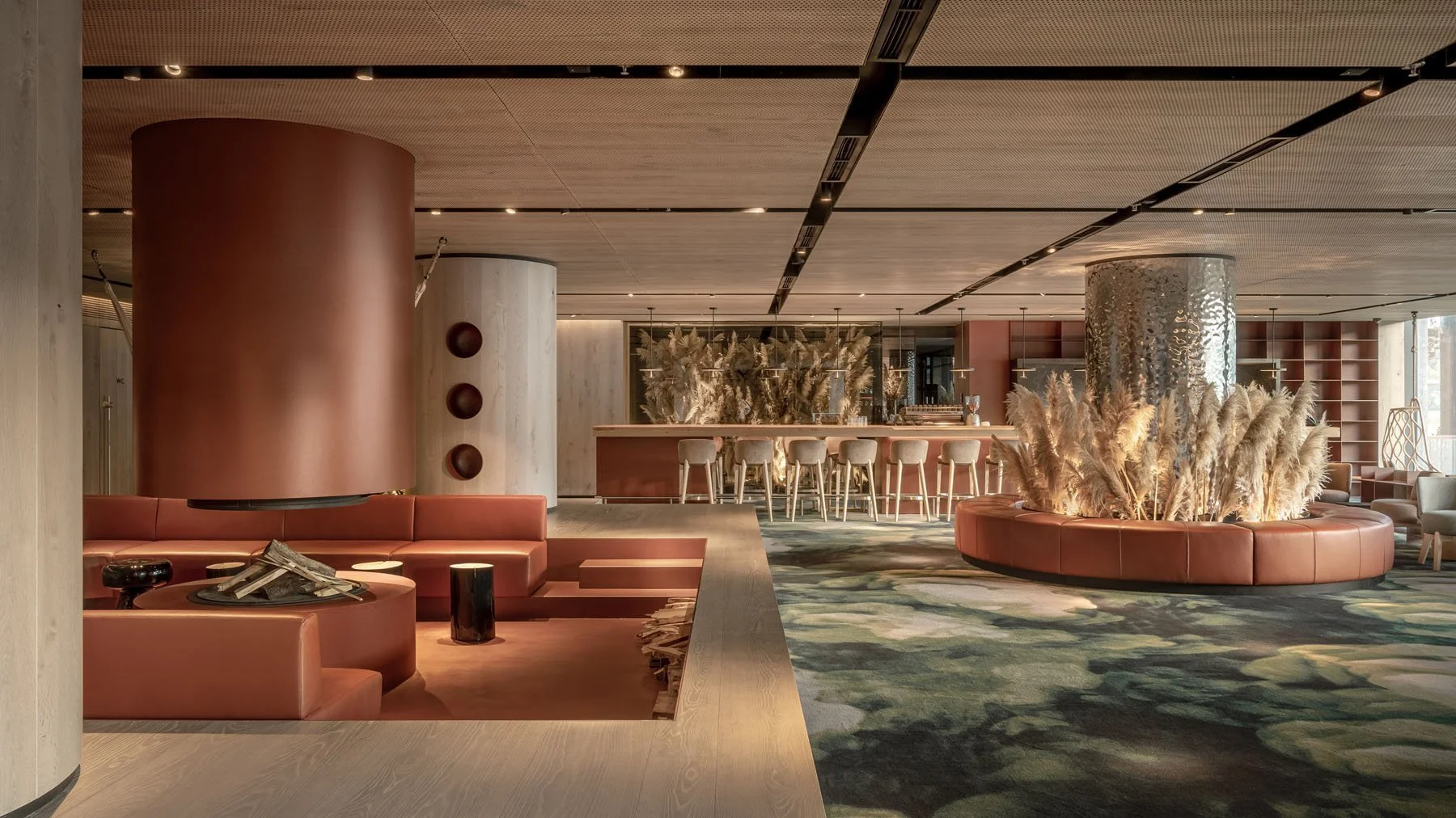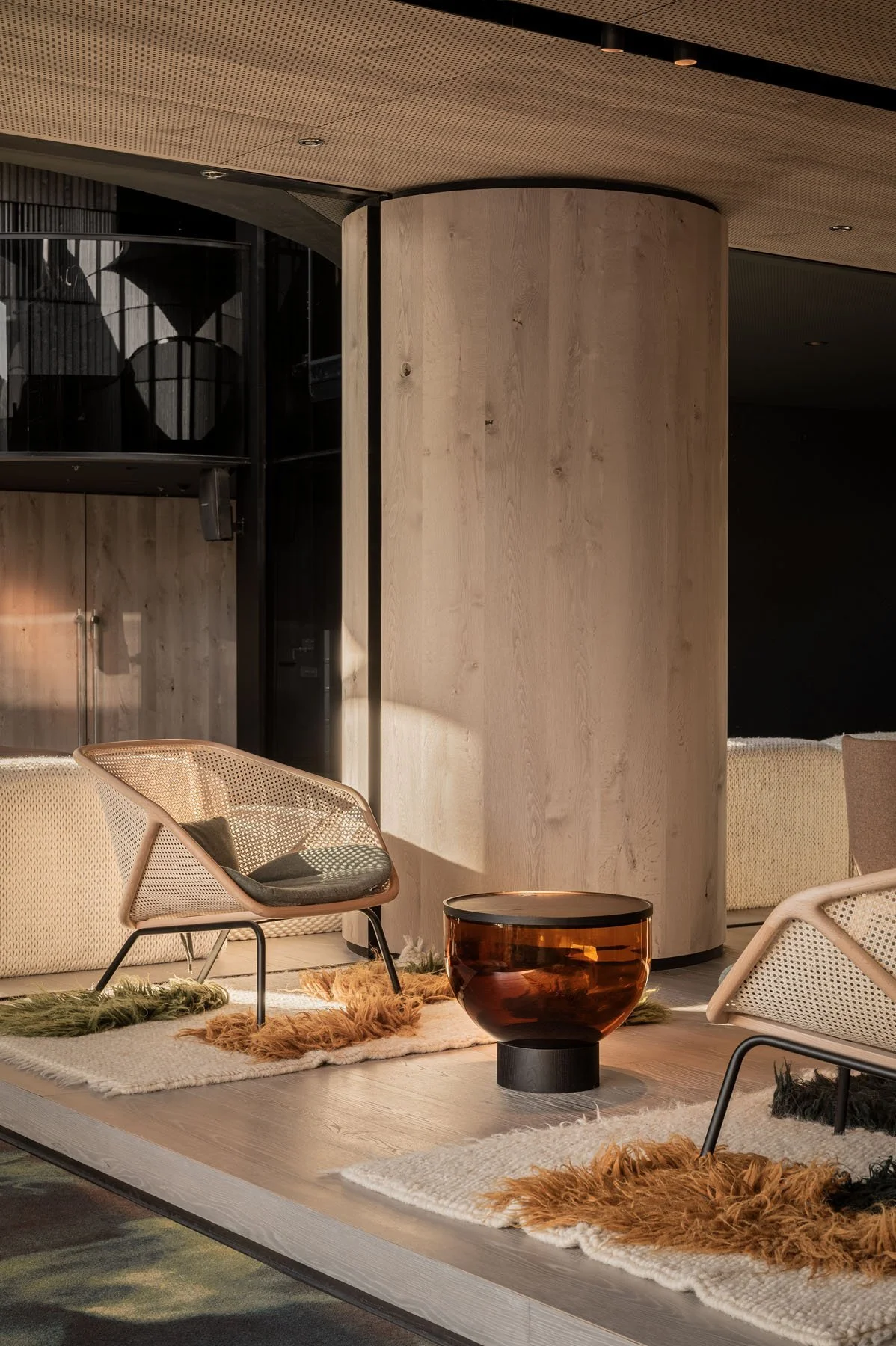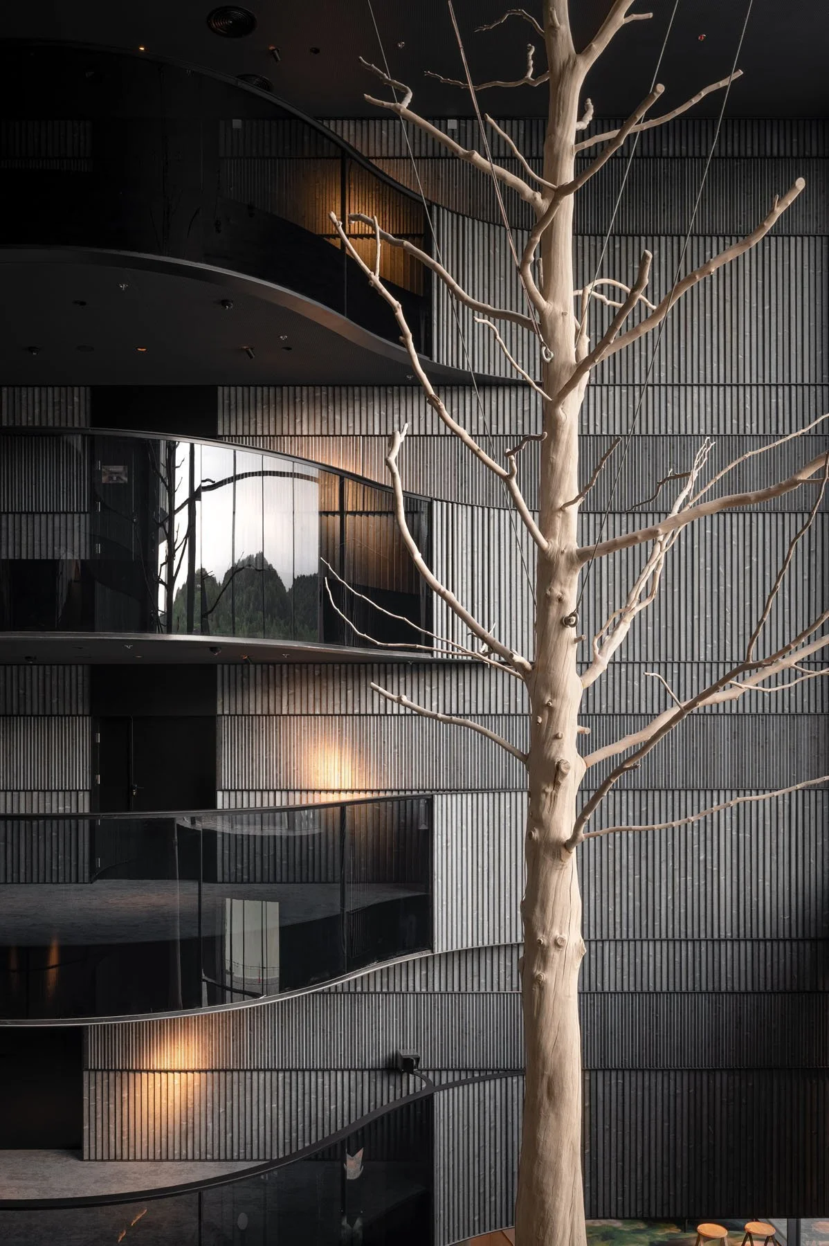 Його природній обрис контрастує з ритмічною геометрією довкола – горизонталями поверхів, вертикалями дошок в покритті стінта та діагоналями металевих поручнів на сходах. Прилягши на круглий шкіряний пуф в холі, гості готелю отримують унікальний емоційний досвід від споглядання дерева знизу, крізь коріння.