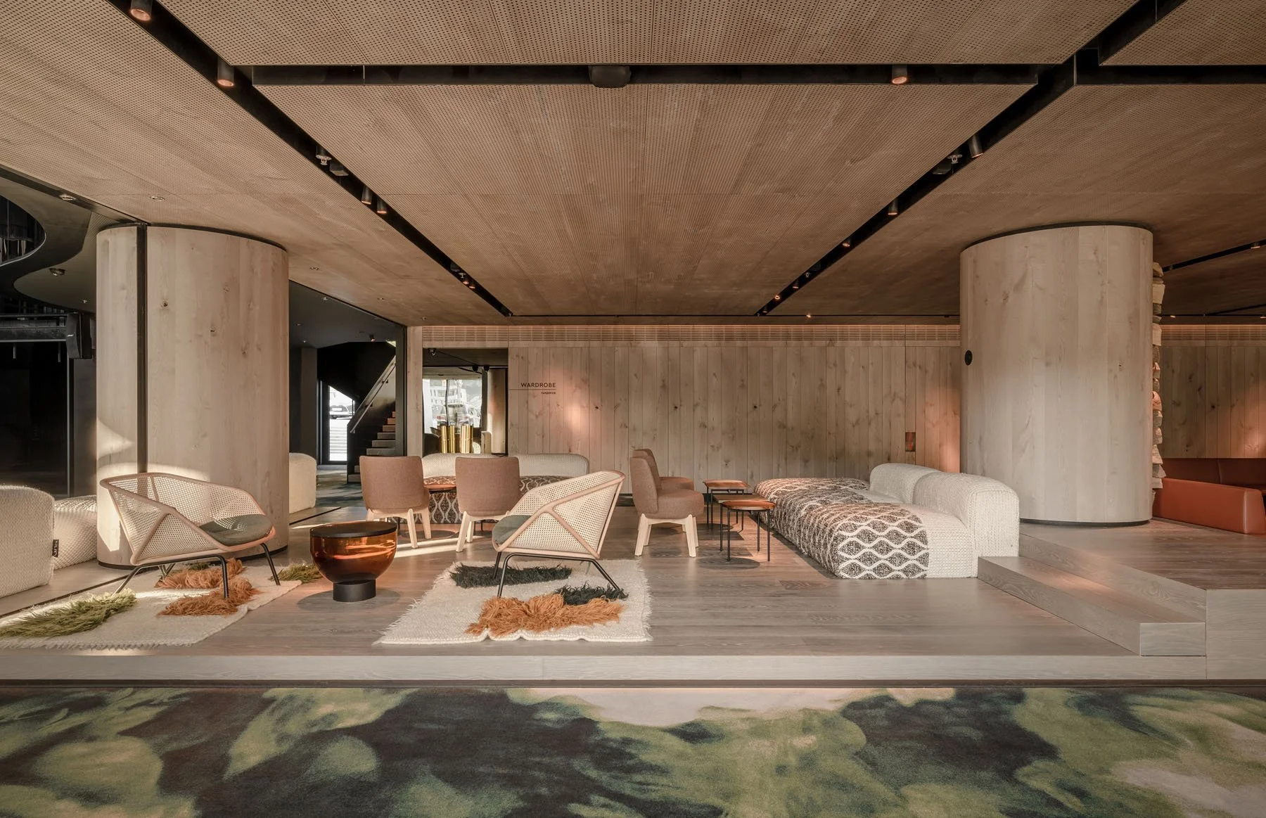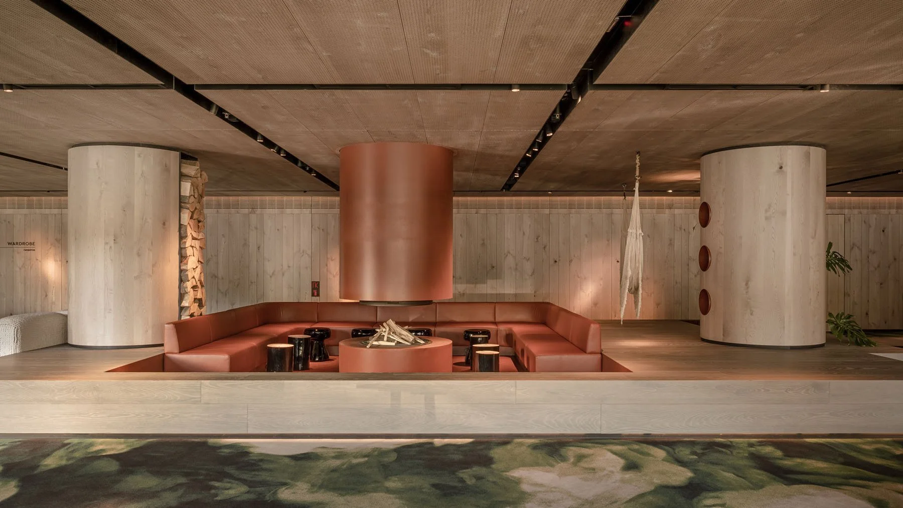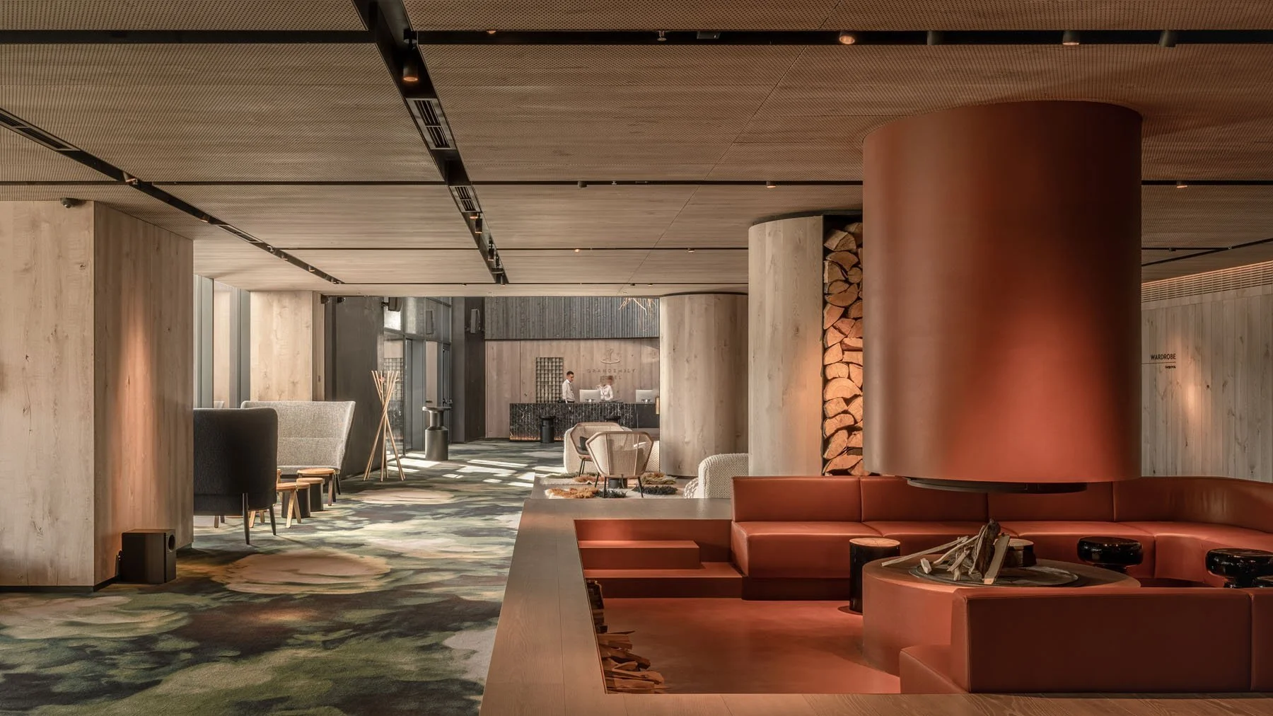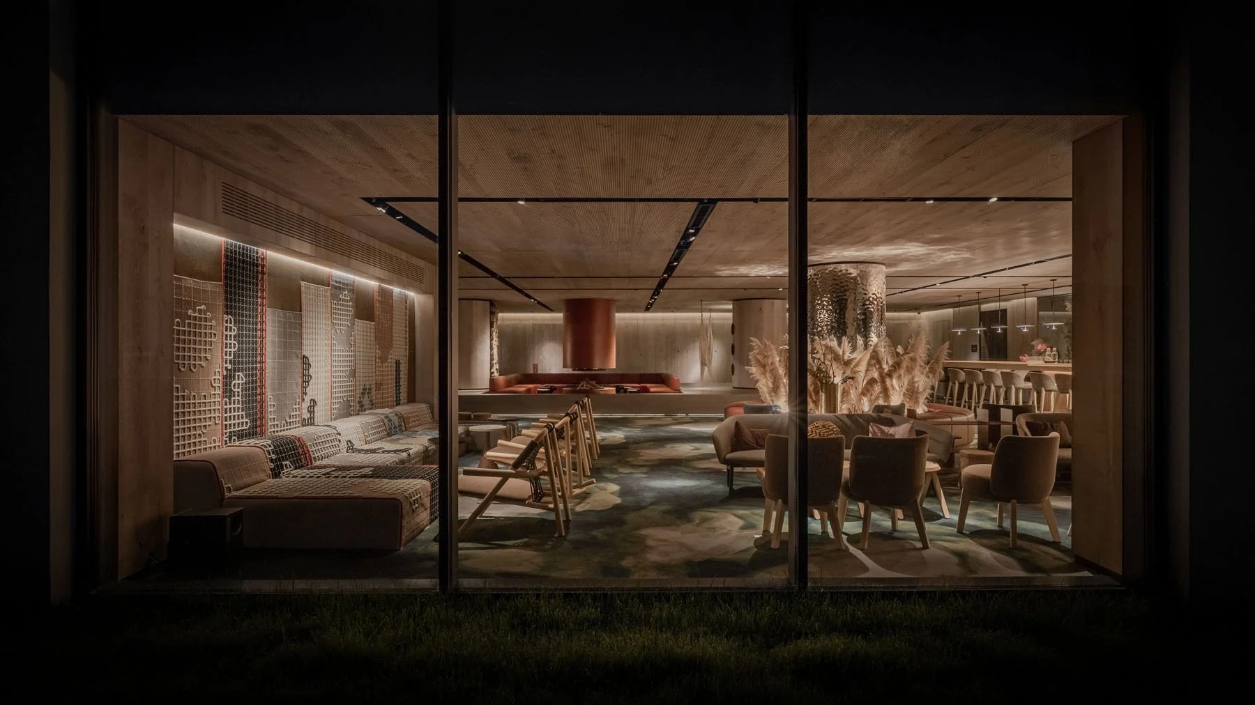 Його природній обрис контрастує з ритмічною геометрією довкола – горизонталями поверхів, вертикалями дошок в покритті стінта та діагоналями металевих поручнів на сходах. Прилягши на круглий шкіряний пуф в холі, гості готелю отримують унікальний емоційний досвід від споглядання дерева знизу, крізь коріння.