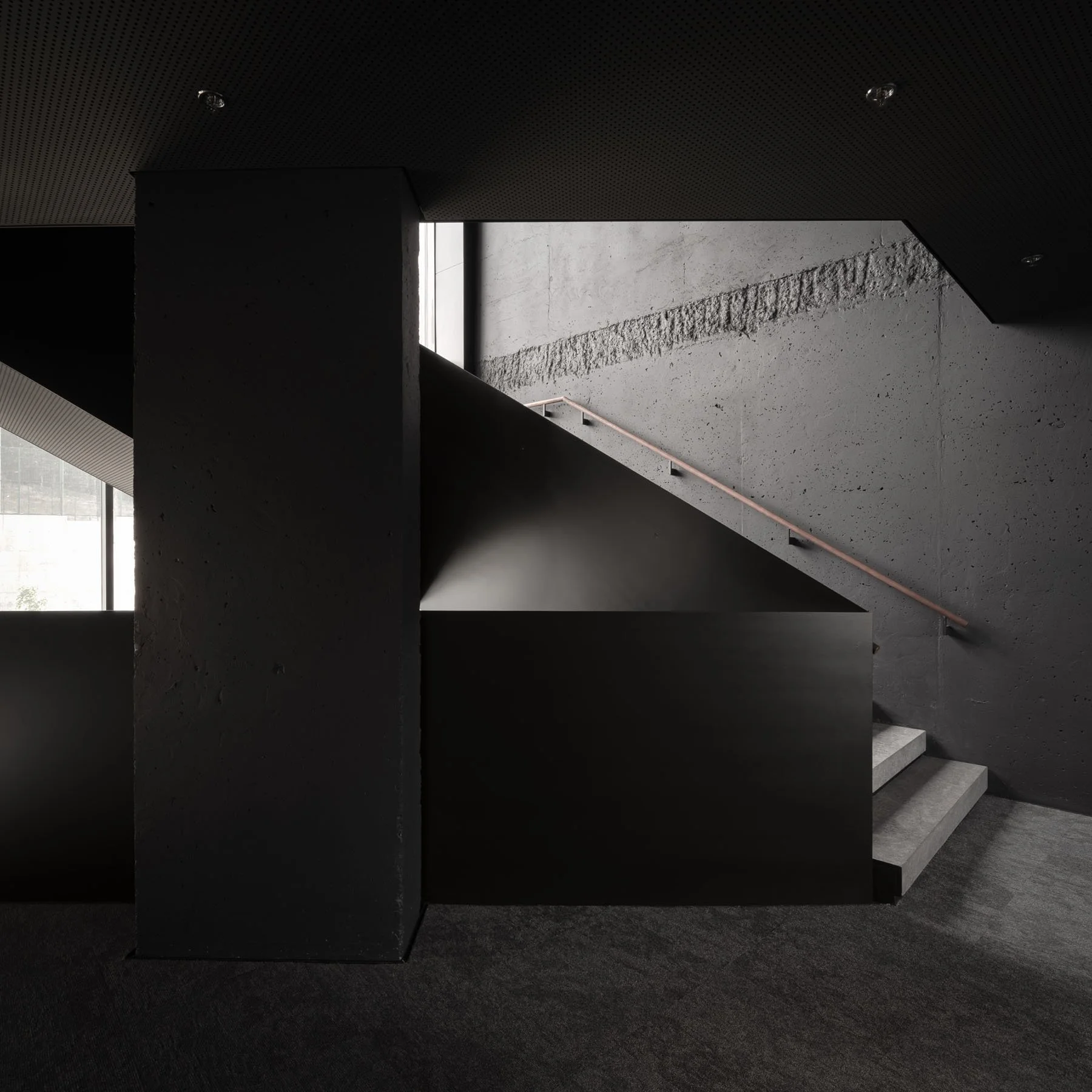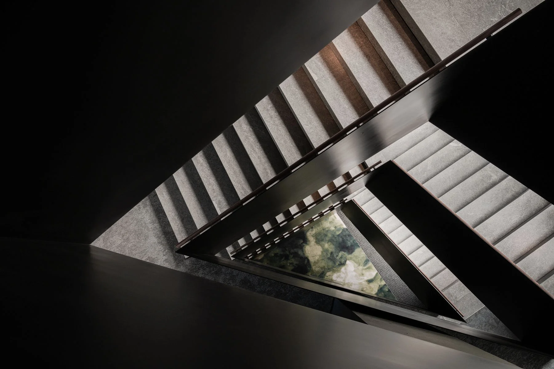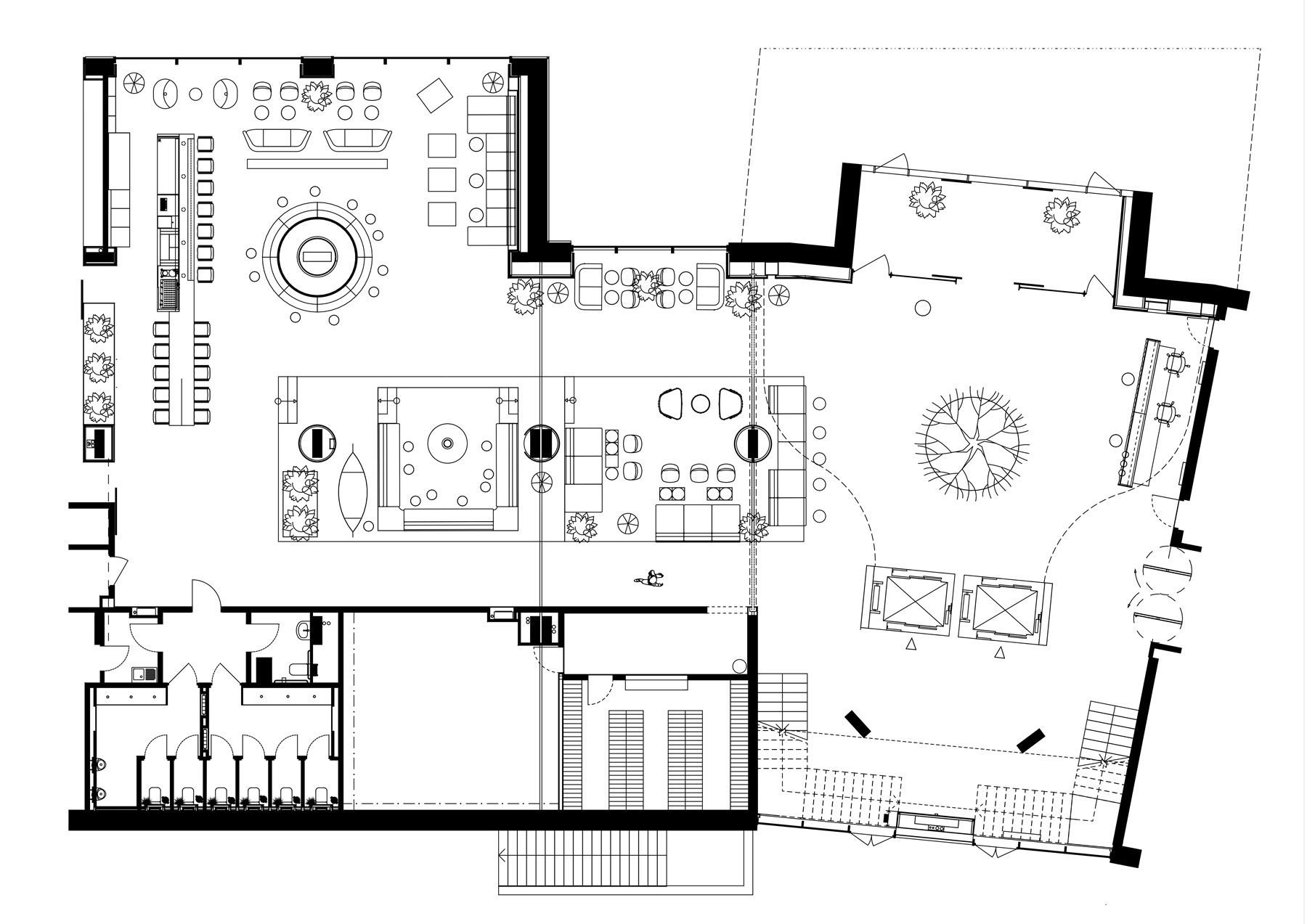 Досконалу геометрію утворює конструкція сходів з металевими поручнями. Центральна зала переходить в зону лаунжу. Тут є два «патіо» – квадратні зони з диванами по периметру та круглою колоною по центру, заглиблені нижче рівня підлоги. В середині колони змонтоване вогнище, захищене склом.