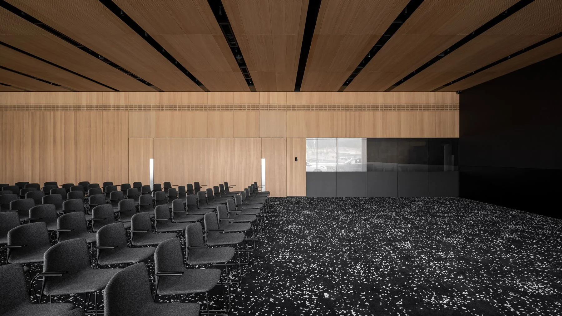 Лаконічна та функціональна конференц-зала на 200 слухачів. Led-екран вздовж всієї стіни дозволяє транслювати зображення, що залишається яскравим і чітким незалежно від сонячної погоди та без необхідності зашторювати вікна.