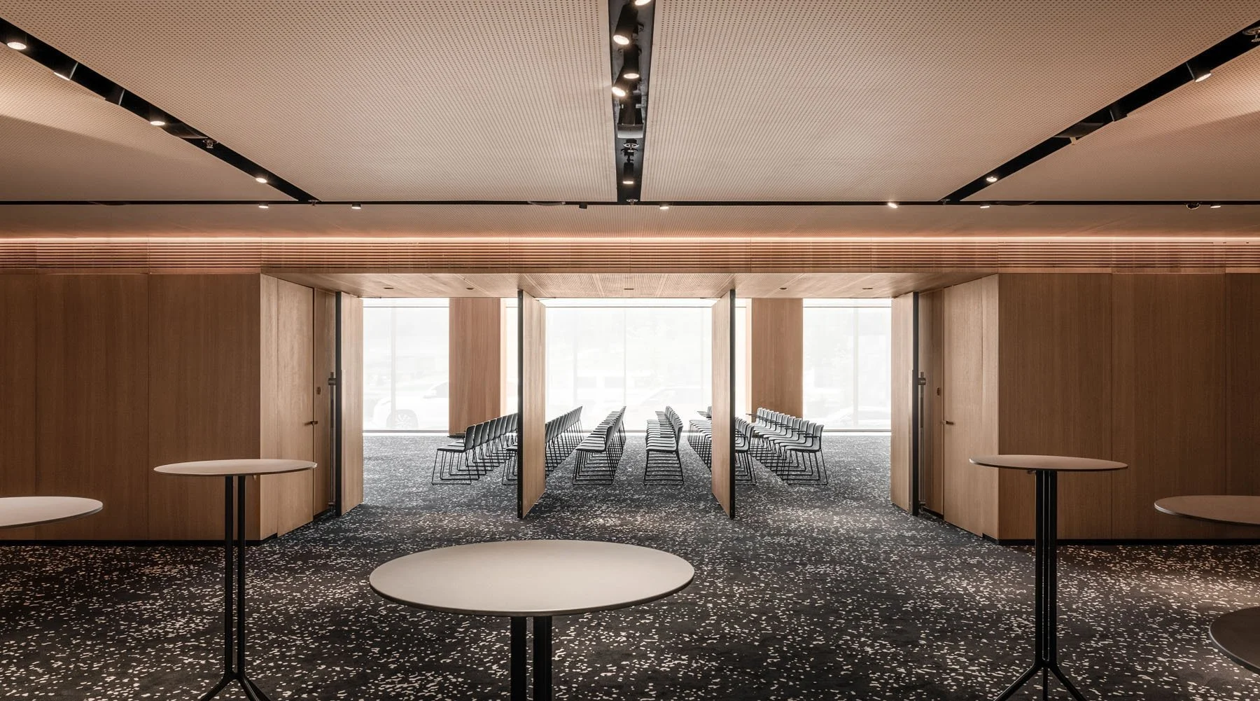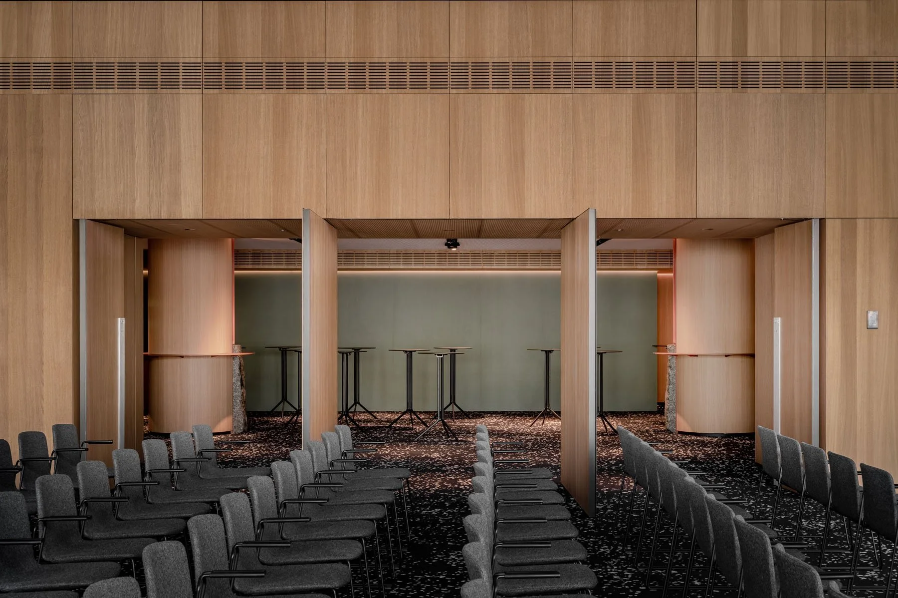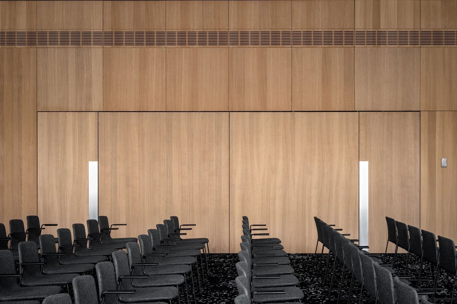 Чисті лінії, дубовий шпон на стінах, біодинамічне освітлення та раціональне використання простору перетворюють це приміщення на ефективний інструмент для бізнесу, навчання та зміцнення корпоративної культури. Технічна рубка конференц-зали оснащена якісною акустикою, в ній передбачене місце для синхронних перекладачів та повний комплект обладнання для презентацій, семінарів та інших заходів.