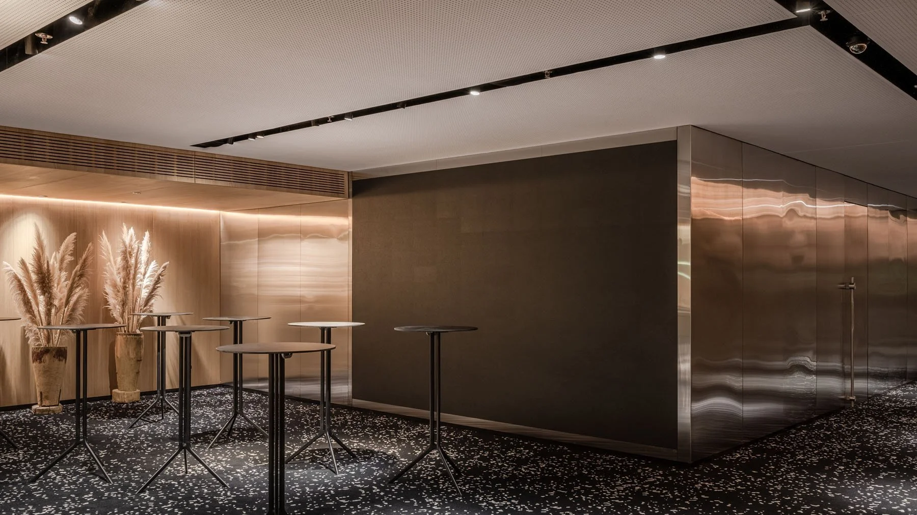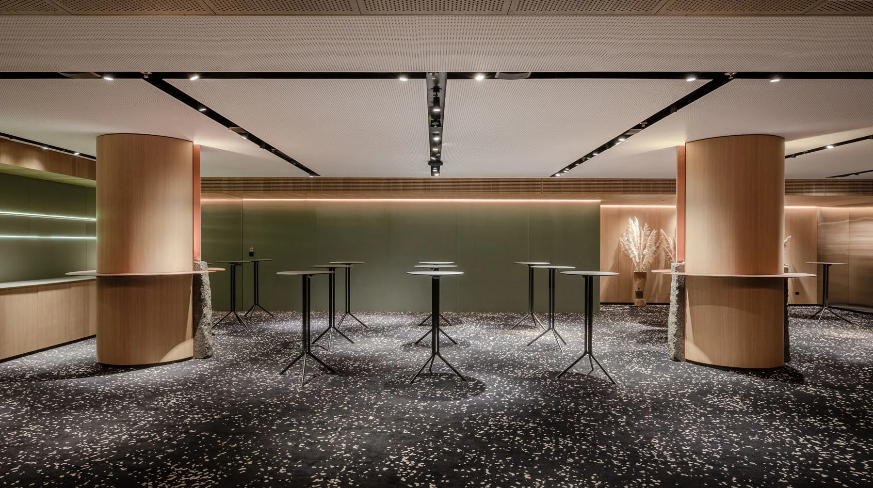 Хол та основну залу розділяють поворотно-осьові конструкції дверей. Коли вони повністю відкриті – приміщення поєднані між собою, коли двері закриті – зала ізольована і ніщо не відволікає увагу слухачів. На стіні холу розміщений бренд-волл. Так само, як основний екран конференц-залу, він створений з LED-елементів. Такий бренд-волл дозволяє змінювати зображення і транслювати рухому картинку. А ще він рятує планету від сотень банерів, які зазвичай опиняються на звалищі після одного використання.