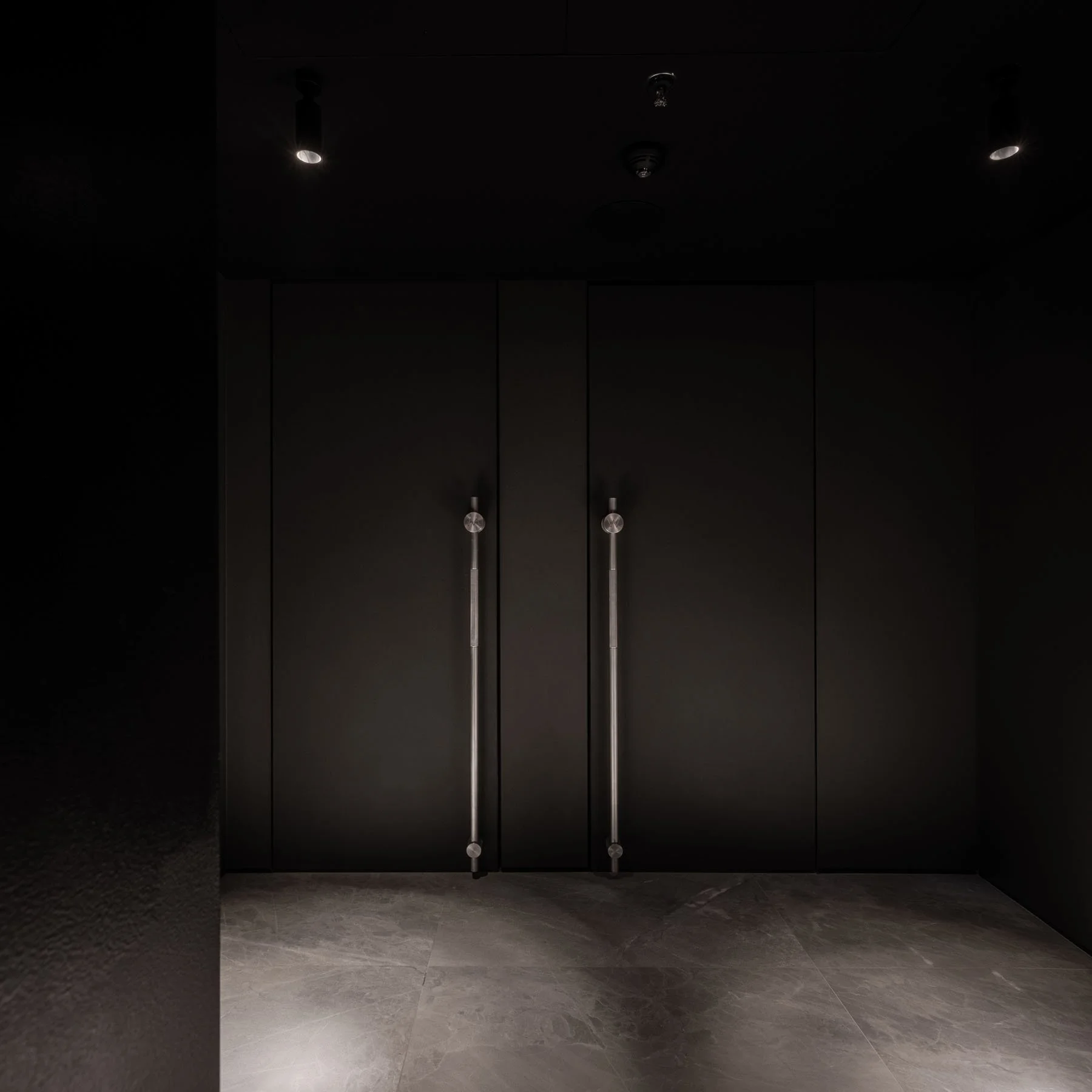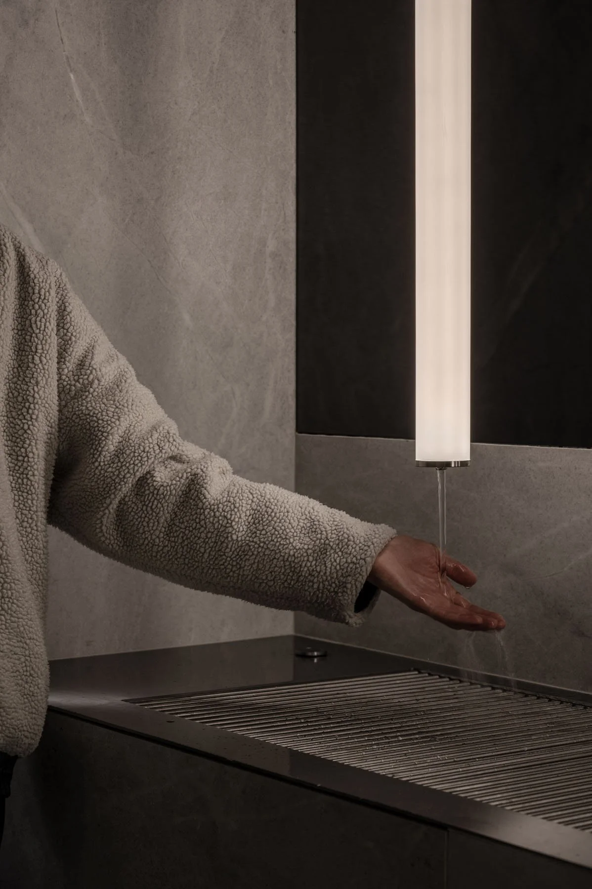 Круглі колони в холі мають вставки з натурального каменю. Вертикальні брили немовби розрізають колону навпіл, виростаючи з підлоги. Це метафоричне нагадування про те, що у будь-яких знаннях важливо доходити до суті і розуміти природу речей. Без міцного базису не буде гармонійної конструкції. Кам’яні вставки – чи не єдиний декоративний елемент в проекті.