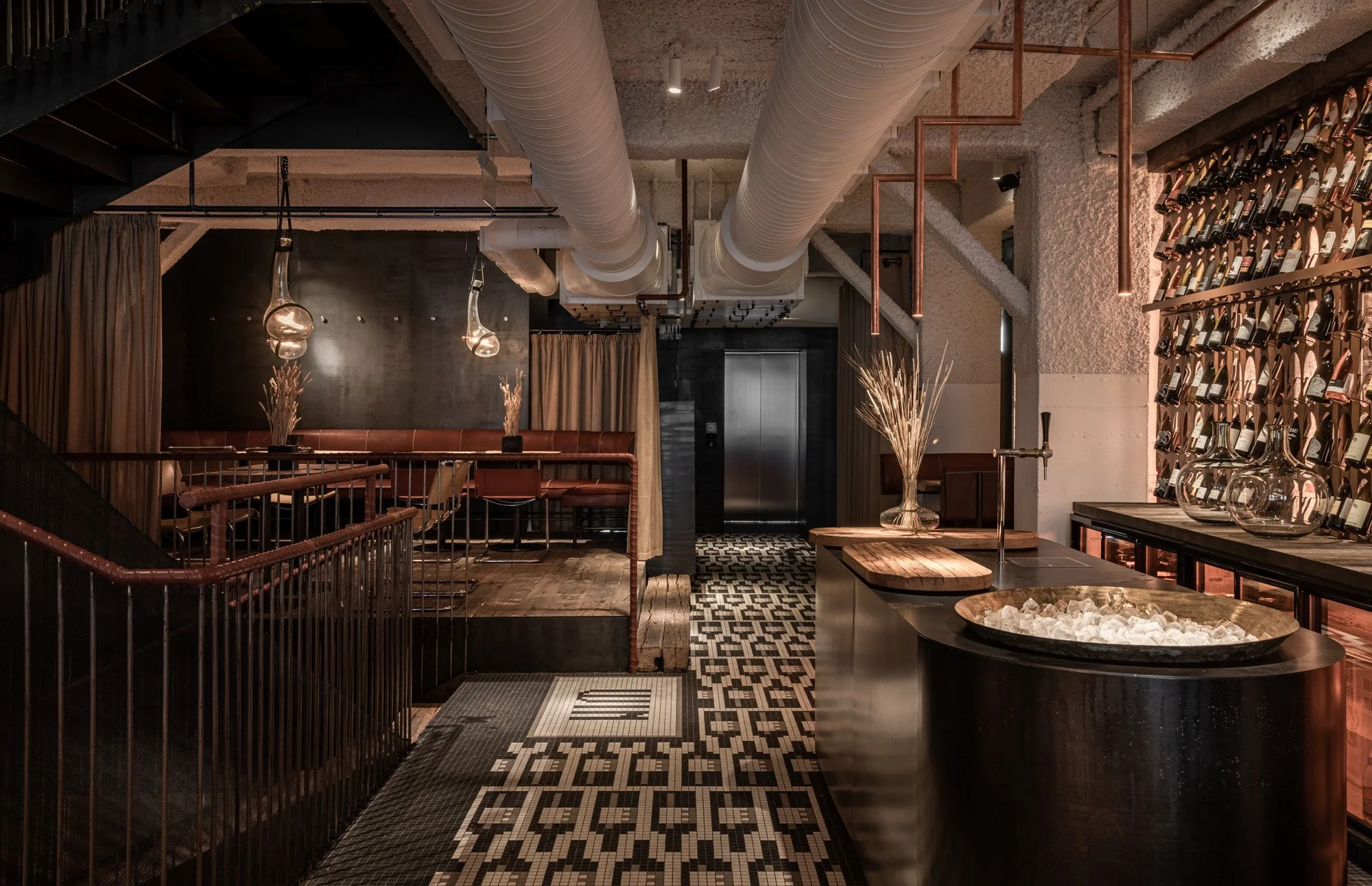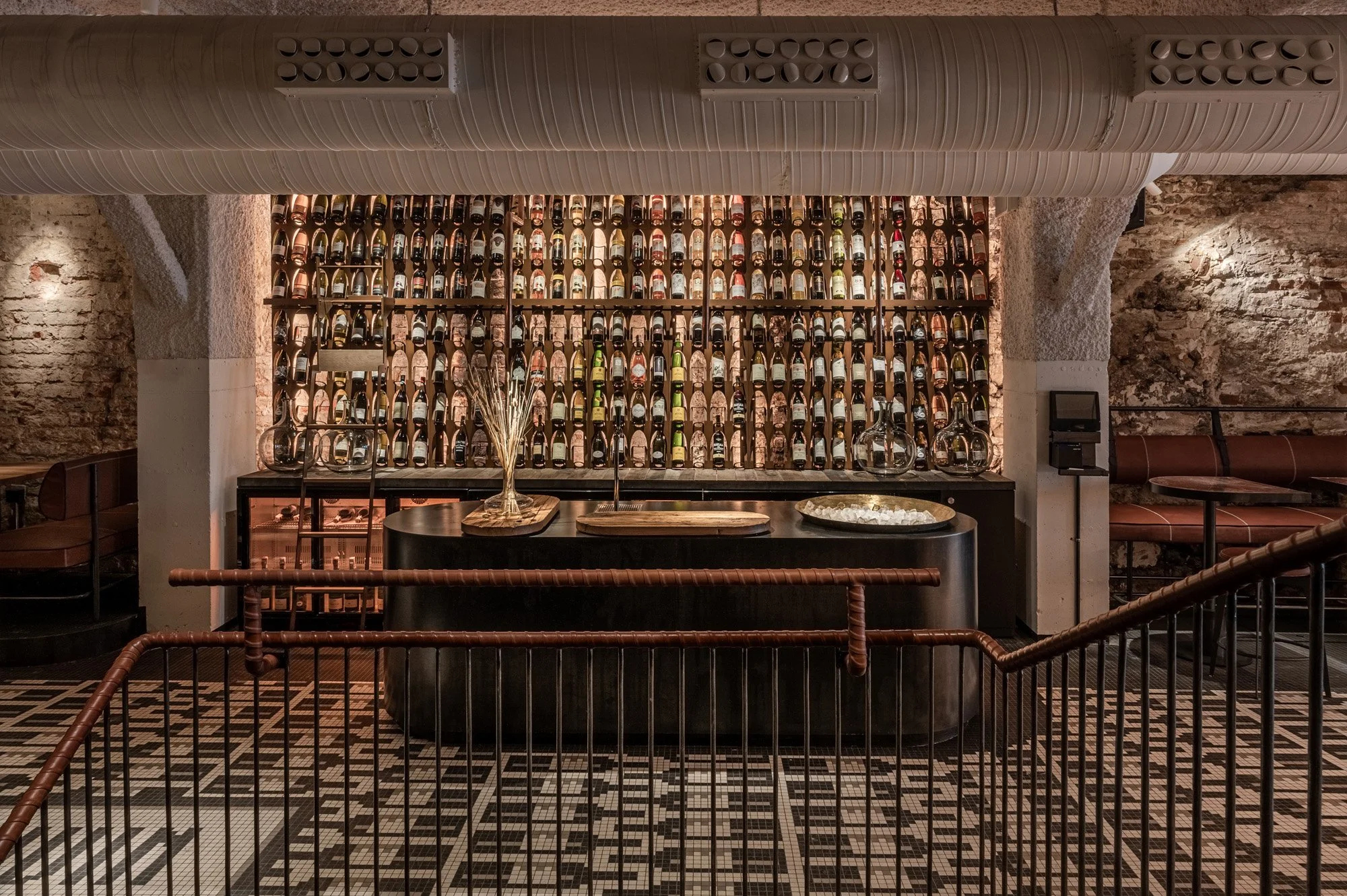 На другому поверсі розміщений Vin Bar з дизайном, що підкреслює винну тематику. Одна зі стін декорована дерев’яними формами лиття. Вони приїхали сюди з місцевої майстерні, де ми замовили серію кастомних декантерів спеціально для закладу. Над круглим столом висить лампа з виноградної лози, під ногами – мозаїка з патерном у вигляді пляшок.