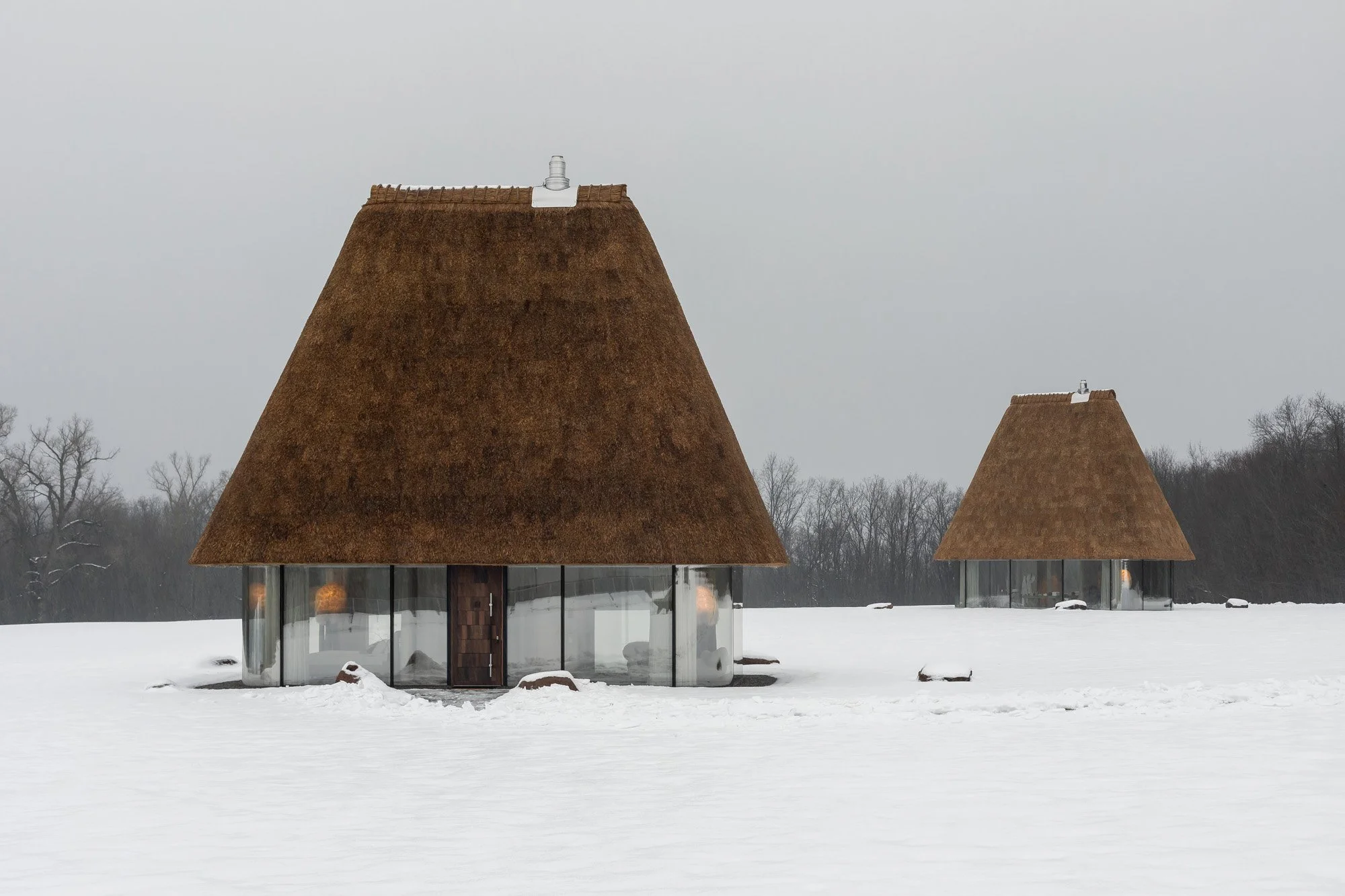 Гостьові будинки, розташовані на території приватної садиби в центральній частині України, є концептуальним переосмисленням архетипу традиційної української хати-мазанки.