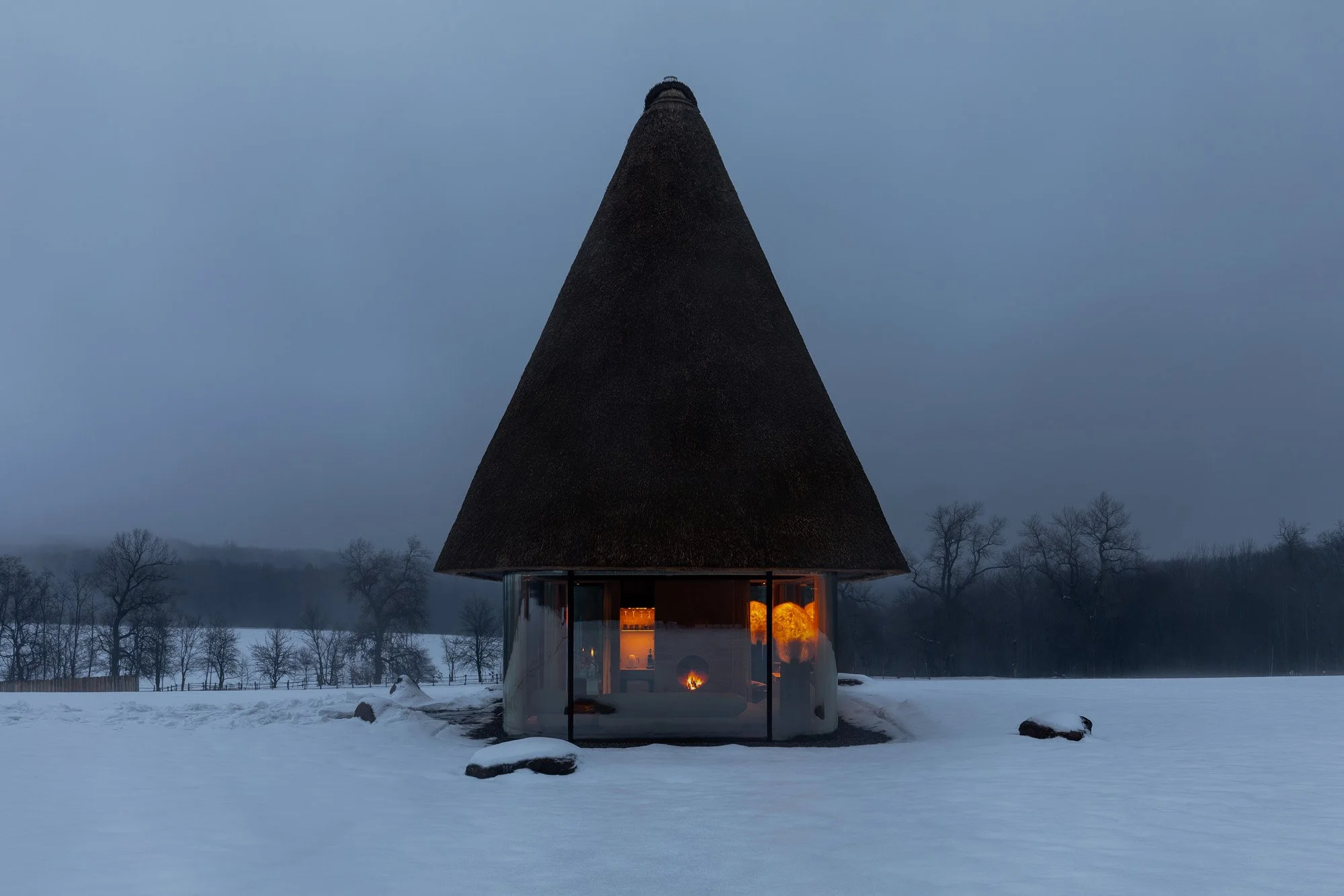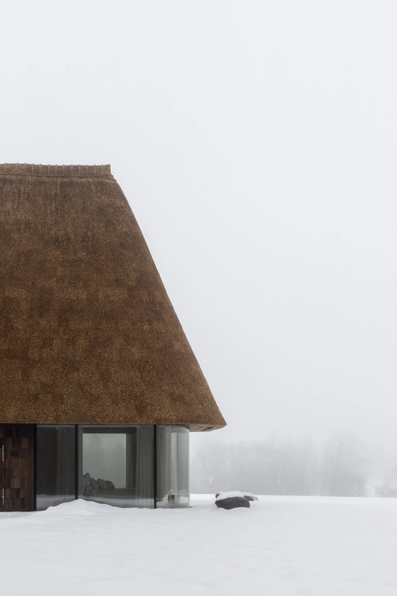 У денний час прозорі зовнішні стіни практично зникають, створюючи ілюзію левітації масивного очеретяного даху. Підлога всередині та зовні будинку виконана з однорідного кам’яно-килимового покриття, яке є приємним на дотик і створює легкий масажний ефект під час ходіння босоніж. Суцільне скління підсилює відчуття повного занурення в природу, де краєвид стає частиною емоційного досвіду. За потреби гості можуть відокремитися від зовнішнього світу за допомогою щільних, але візуально легких штор, керування якими відбувається автоматично – кнопка розташована в узголів’ї ліжка.