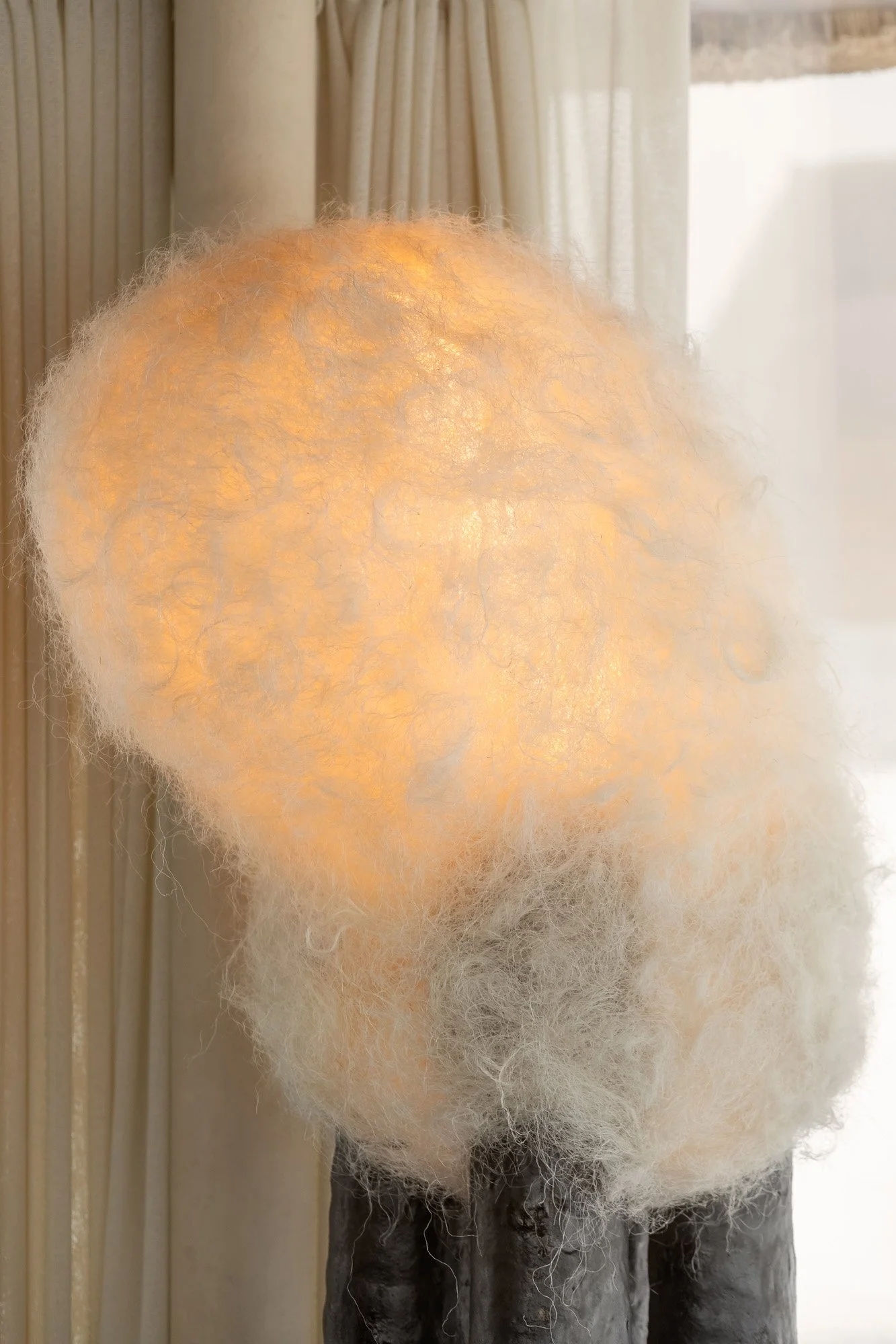 Інтер’єр вирішений у дусі сучасного еко-мінімалізму. Натуральна, стримана палітра, різноманітні тактильні поверхні та предмети українських брендів формують цілісний, заспокійливий простір. У будинку використано меблі Noom, декор із чорної глини Guculiya, фактурні дерев’яні елементи. Один із ключових акцентів спальні – масивний кастомний торшер, створений дизайнерами Yod Group, із кераміки та натуральних волокон.