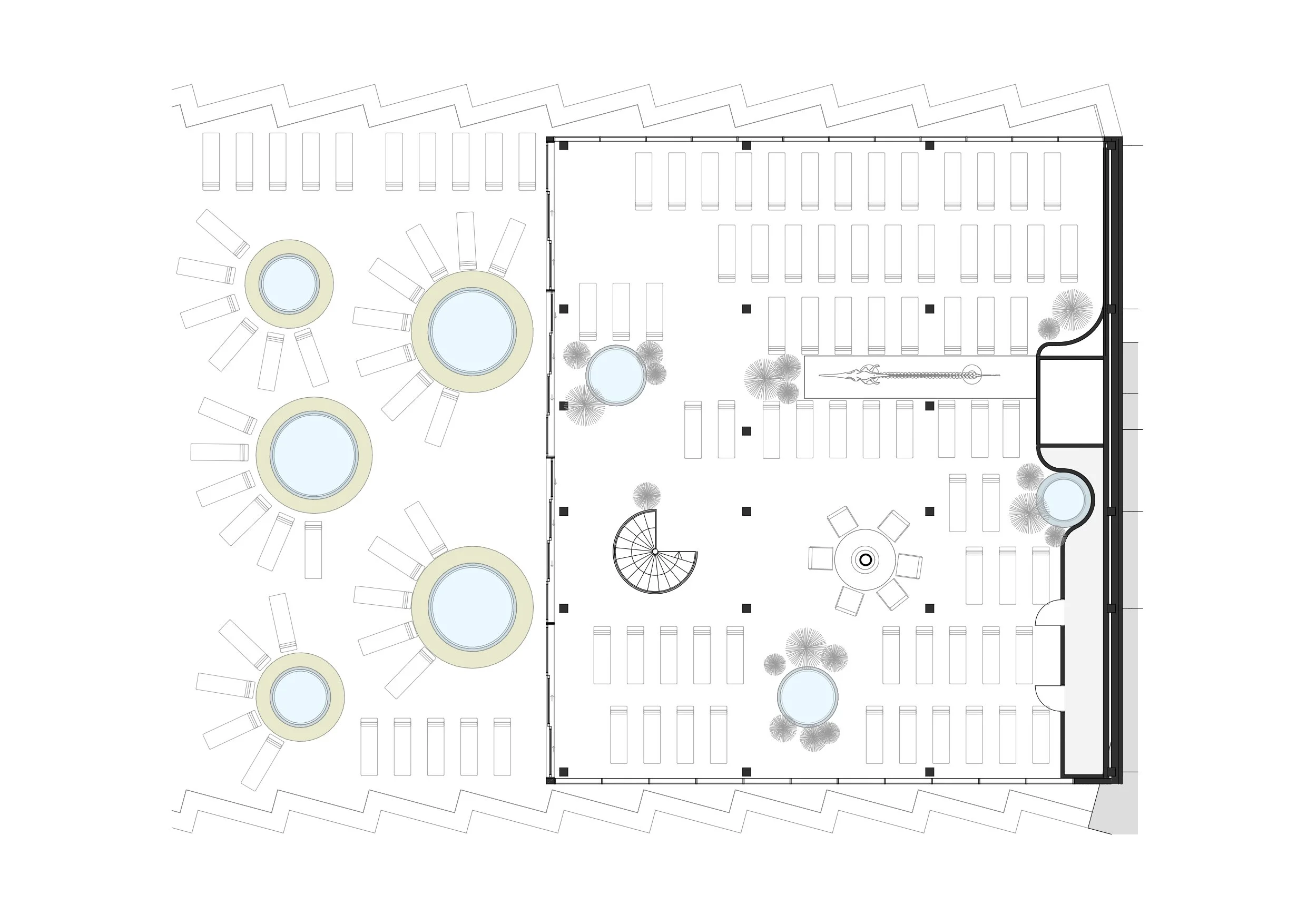 В основі рішення – дерев’яна просторова конструкція. Нерівномірний крок колон задав складну геометрію, яка вимагала ювелірної точності у проєктуванні та монтажі. Кожен елемент каркасу виготовлявся окремо з урахуванням обмежень роботи на даху, а стикування стельових балок під різними кутами було вирішене за принципом пазла. Інженерні системи, зокрема вентиляція, повністю інтегровані в конструкцію і залишаються непомітними.