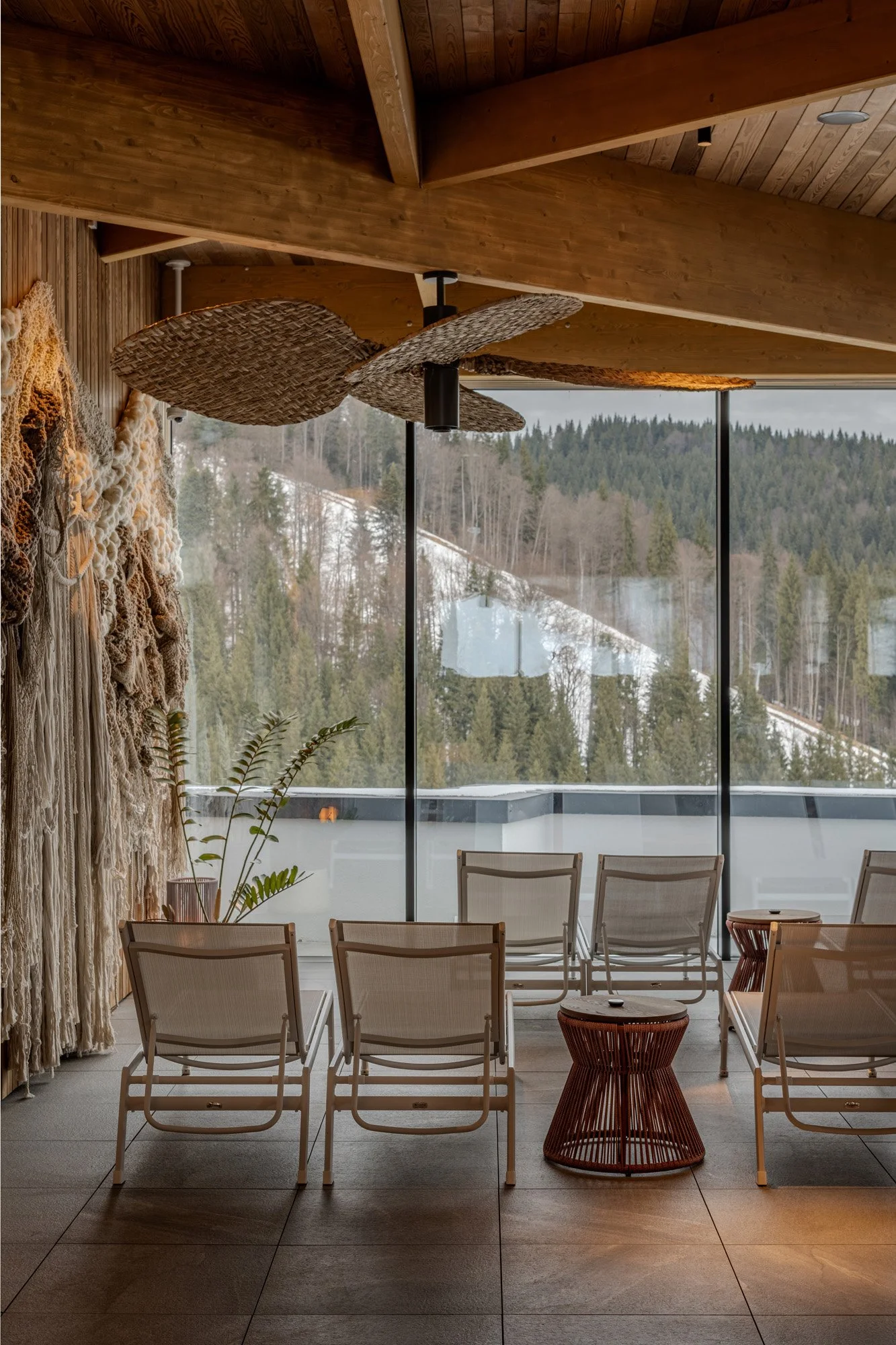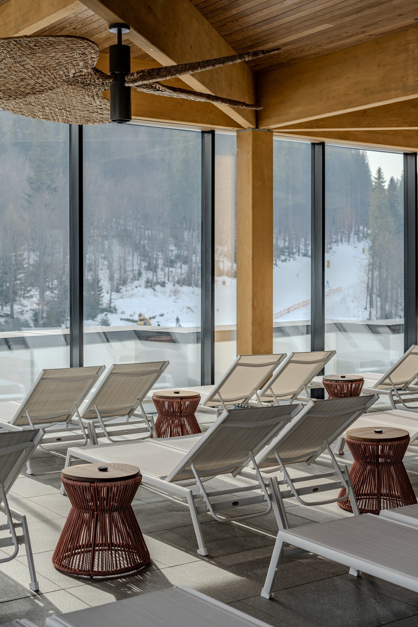 Тему натуральних матеріалів та плетіння продовжують масивні вентилятори, спущені зі стелі. Вони створюють розслаблений настрій, а також виконують функцію освітлення завдяки інтегрованим світильникам. Їхні великі лопаті мають розмах 2 метри та виконані з плетеного рогозу. Пропелери поєднують ремісничу традицію з технологічною функцією, підкреслюючи загальну ідею синтезу автентики та сучасного бачення.