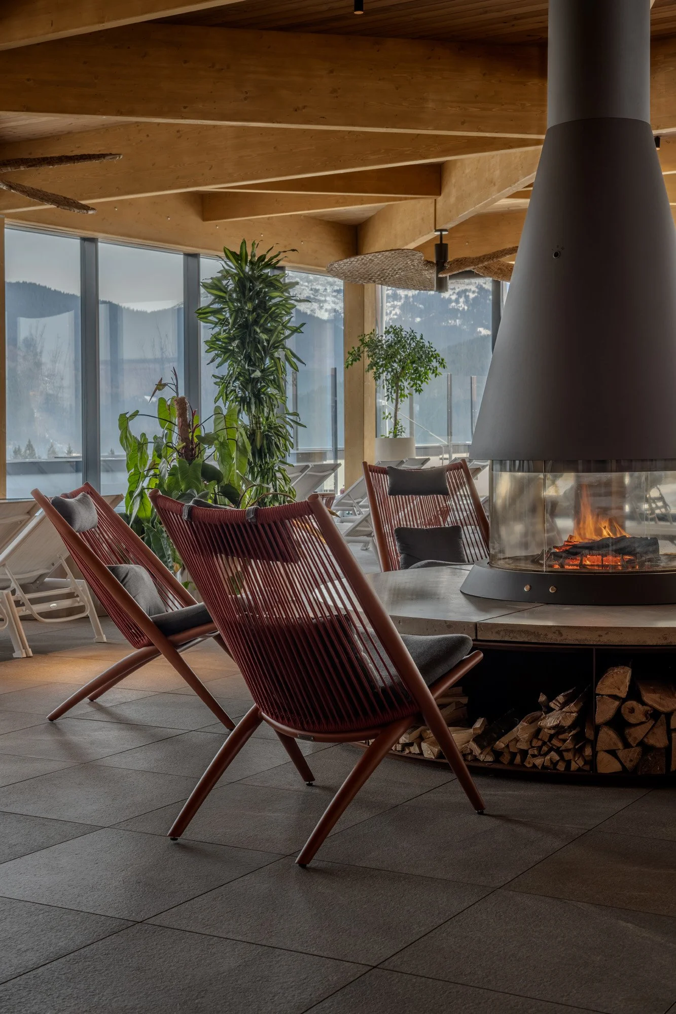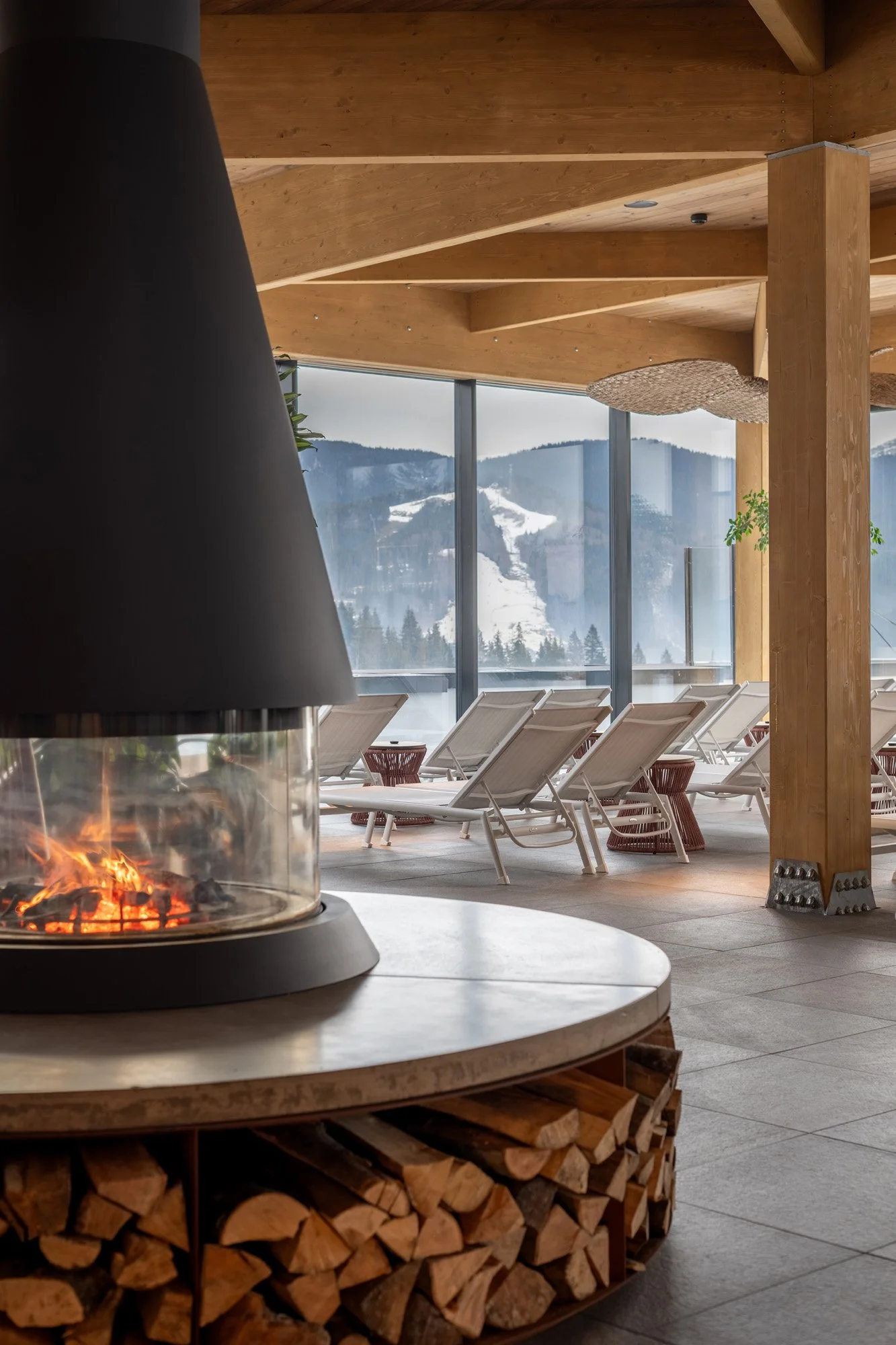 Вдень простір наповнюється природним світлом, що проникає крізь панорамні вікна і підсилює головний акцент – краєвид. Увечері центром тяжіння стає дров'яний камін, навколо якого гості збираються, ніби довкола багаття.