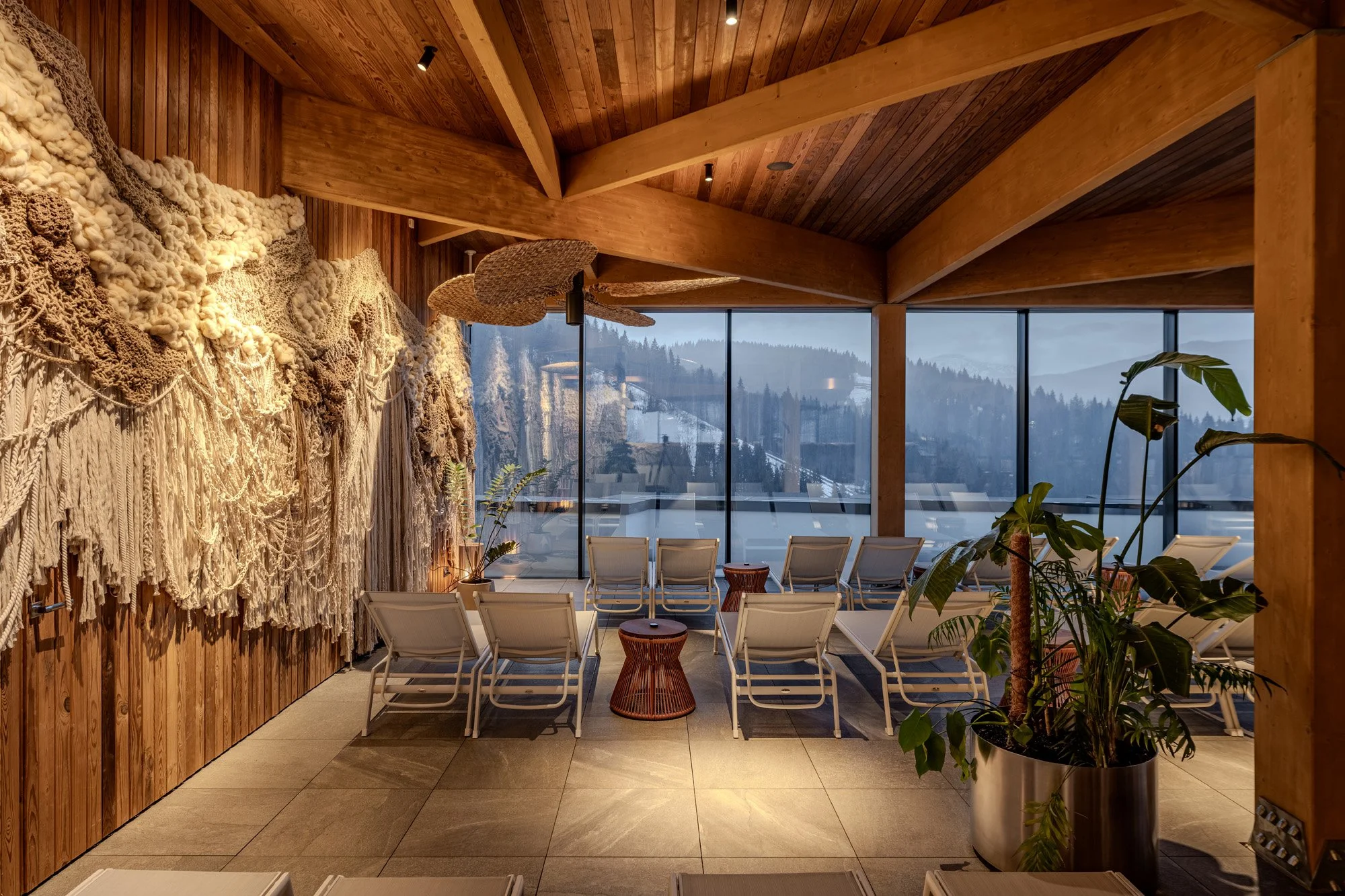 М’яким акцентом інтер’єру є унікальне макраме-панно площею 100 м² – ручна робота та 1500 кг різних типів пряжі. Його виготовлення тривало два місяці. Панно продовжує візуальний мотив, закладений на стіні поряд з рецепцією на першому поверсі готелю, та інтерпретує тему гір через рельєфну текстильну пластику.
